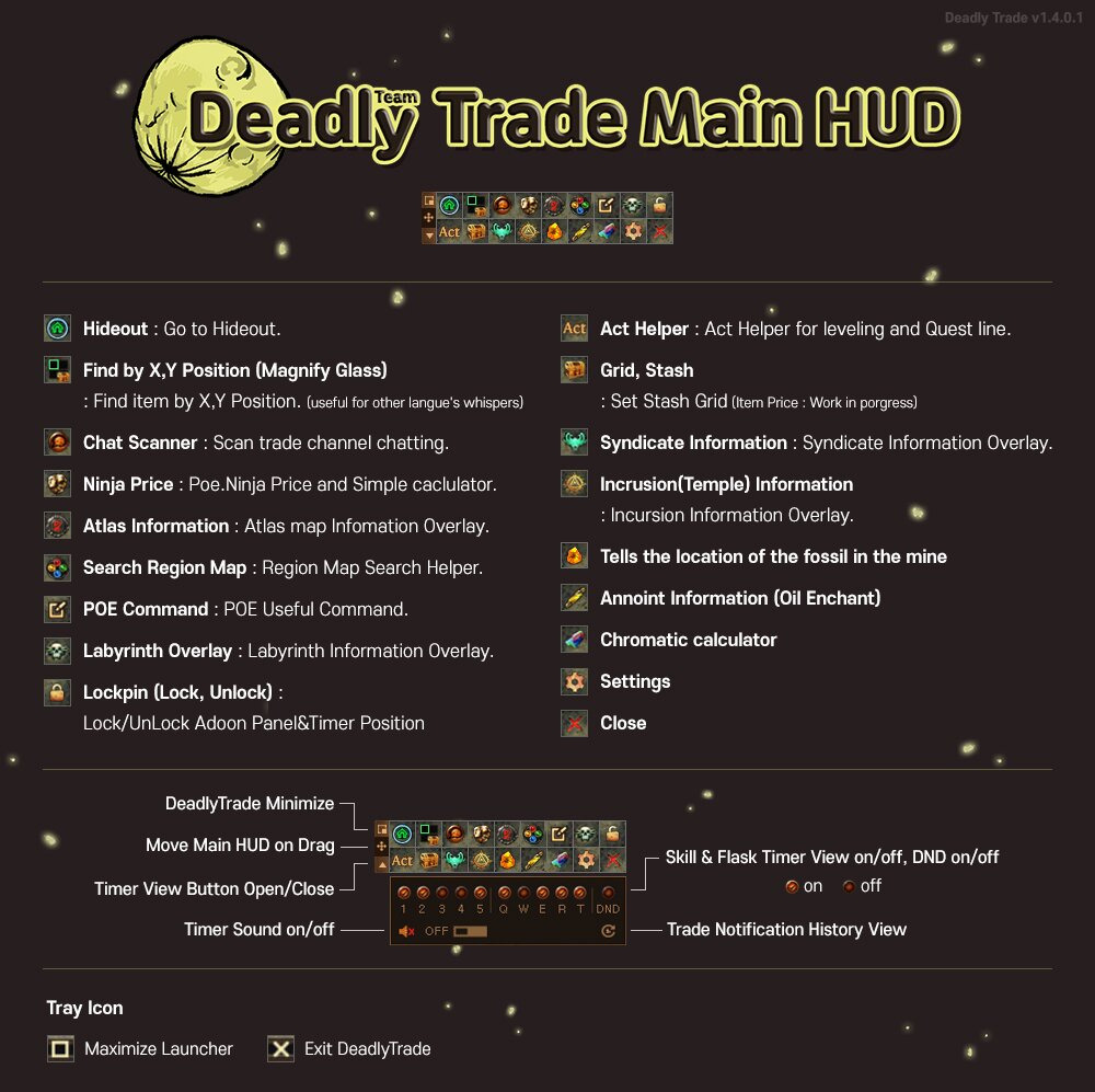DeadlyTrade for Path Of Exile - (Overhaul Version) Trade Notification, Functional Overlay, Flask&Skill Timer, Map&Region Information, Real-Time Ninja Currency, Act Helper when Leveling and other useful functions.