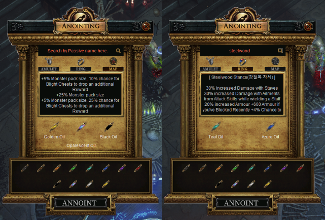 You can get information about Oil Anointments for rings, amulets and maps. You can either put the oils yourself to see what enchant you get or you can search for it using the search bar.