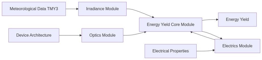The software is divided into individual modules, which handle the irradiation, optics, electrics and energy yield simulations. Those modules can also be operated independently (e.g., calculate the reflectance, transmittance, absorptance of a solar cell architecture).