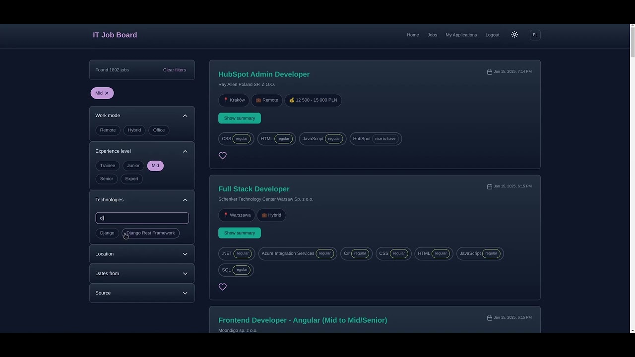 A centralized platform for IT job seekers in Poland, aggregating listings from multiple job boards.