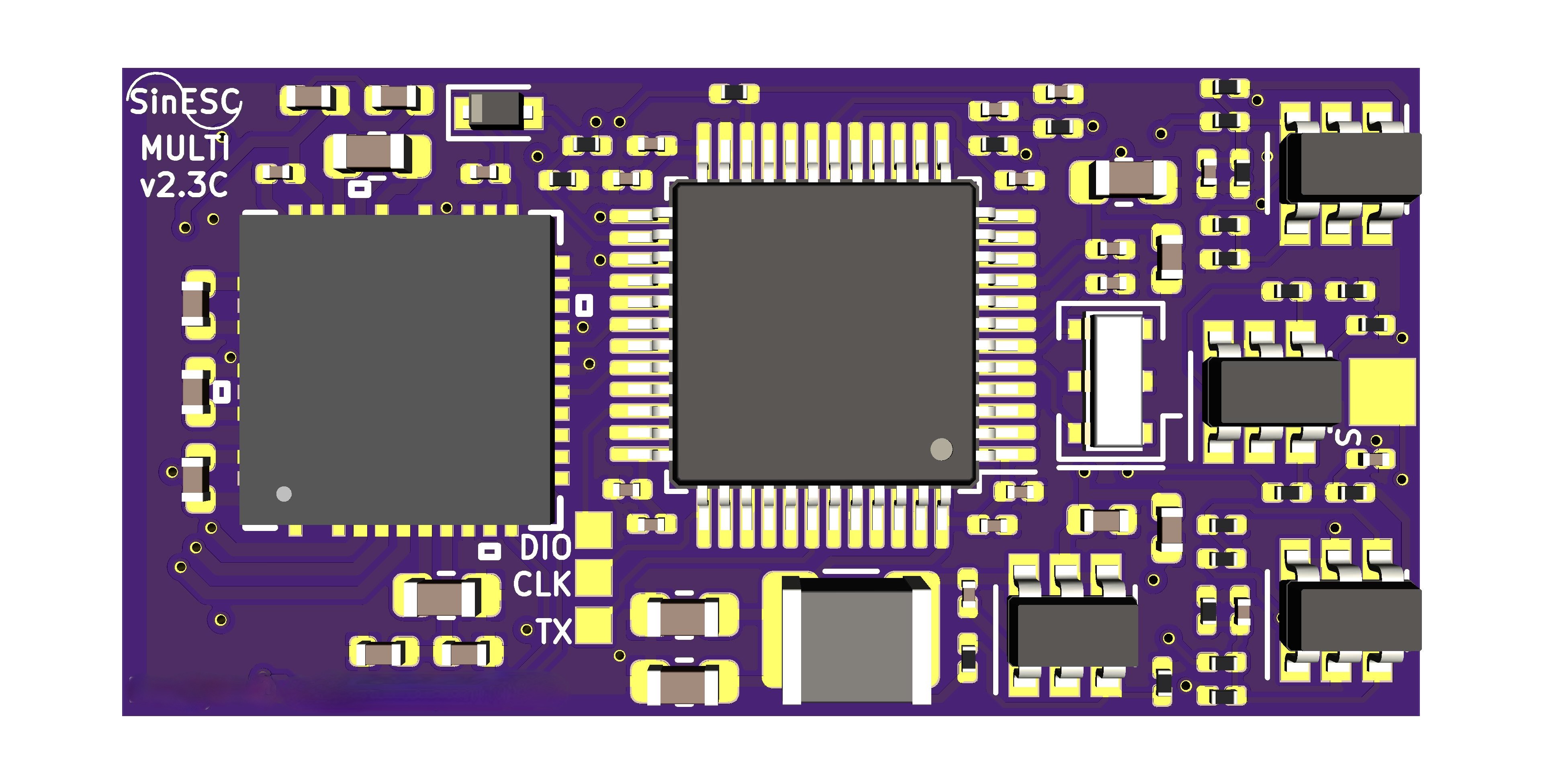 The 15x30mm SinESC Multi Edition PCB uses 0201-sized components when possible for reduced parasitic influences and reduced size. Maximum component density is approximately 50 components/cm². The microcontroller, gate driver, and current-sense amplifiers (all the control electronics) are implemented on the top layer, leaving the bottom layer for the power electronics. This provides room for wide traces. Multi Edition is designed in KiCAD and adheres to OSHPark design rules. All additional libraries are within the project files.