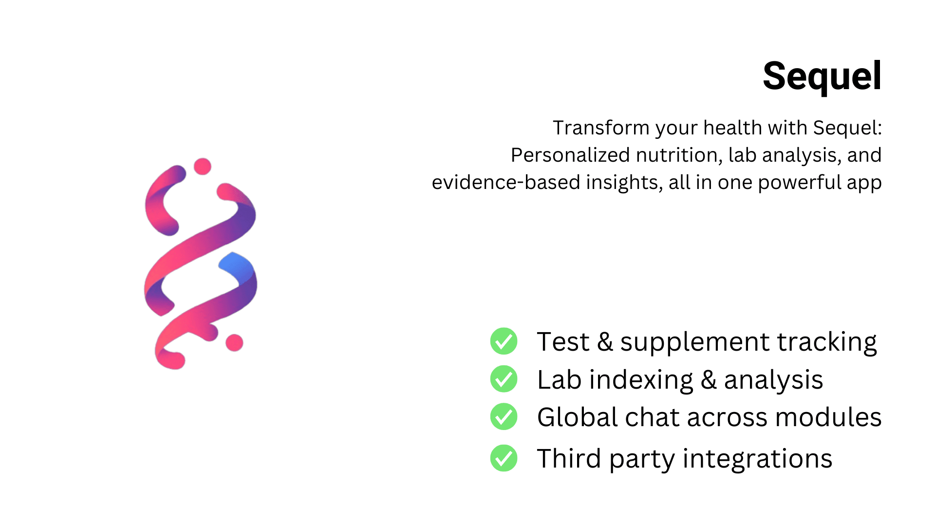 Sequel is an open-source software application meticulously designed to be your ultimate companion in taking control of your health through personalized nutrition. By leveraging our cutting-edge platform, users can effortlessly analyze lab reports, track supplement and nutrient intake, and access a comprehensive library of evidence-based information. Our mission is to empower you with the tools and knowledge necessary to make informed decisions about your well-being, guiding you towards a healthier, longer life.