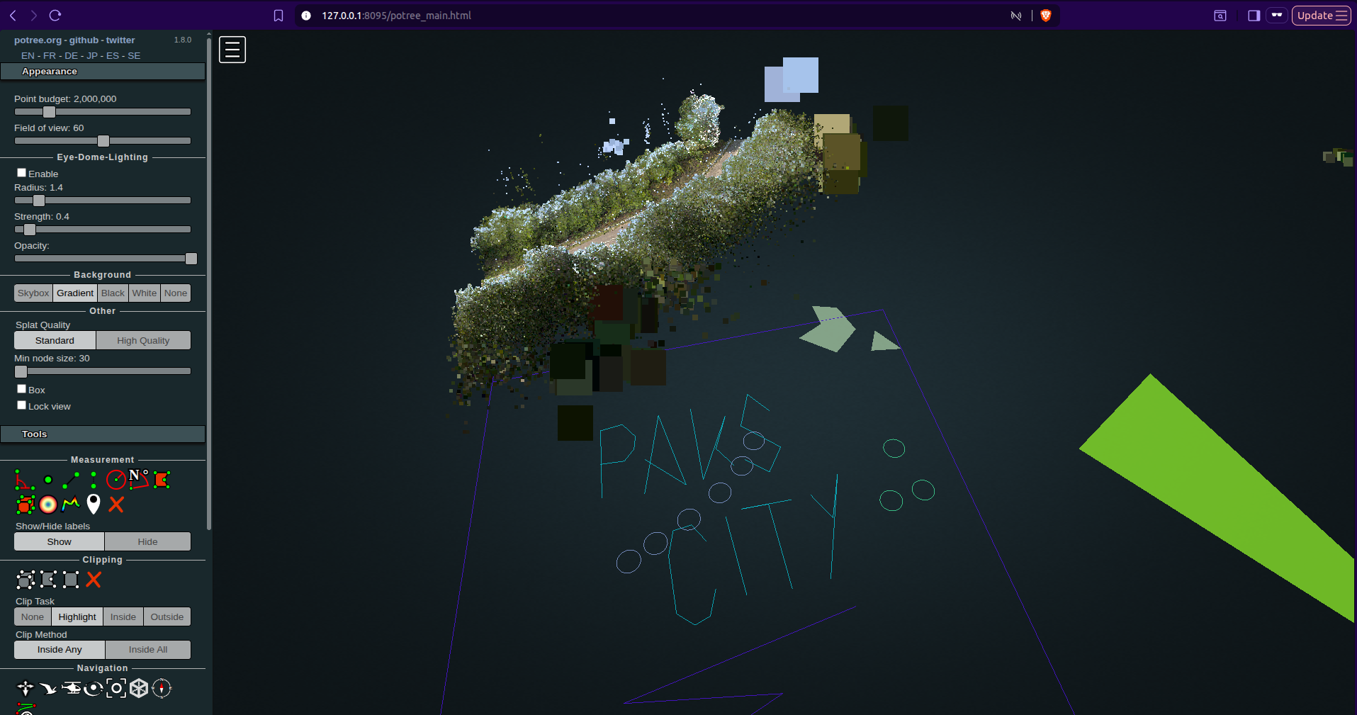 Test output pointcloud with openstreetmap data pulled with cesium, map elevated to 150 meters above sea level: