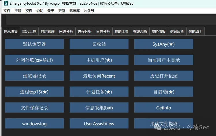 EmergencyTookit 是一款专为Windows系统设计的应急响应解决方案,旨在帮助用户在面对系统安全事件、故障排查等紧急情况时,能够迅速、高效地收集关键信息、定位问题根源并采取相应措施。
