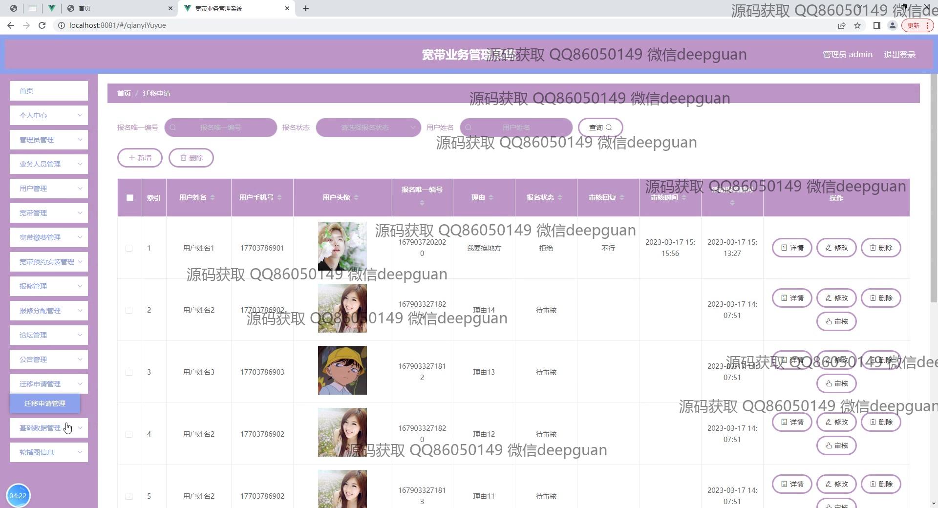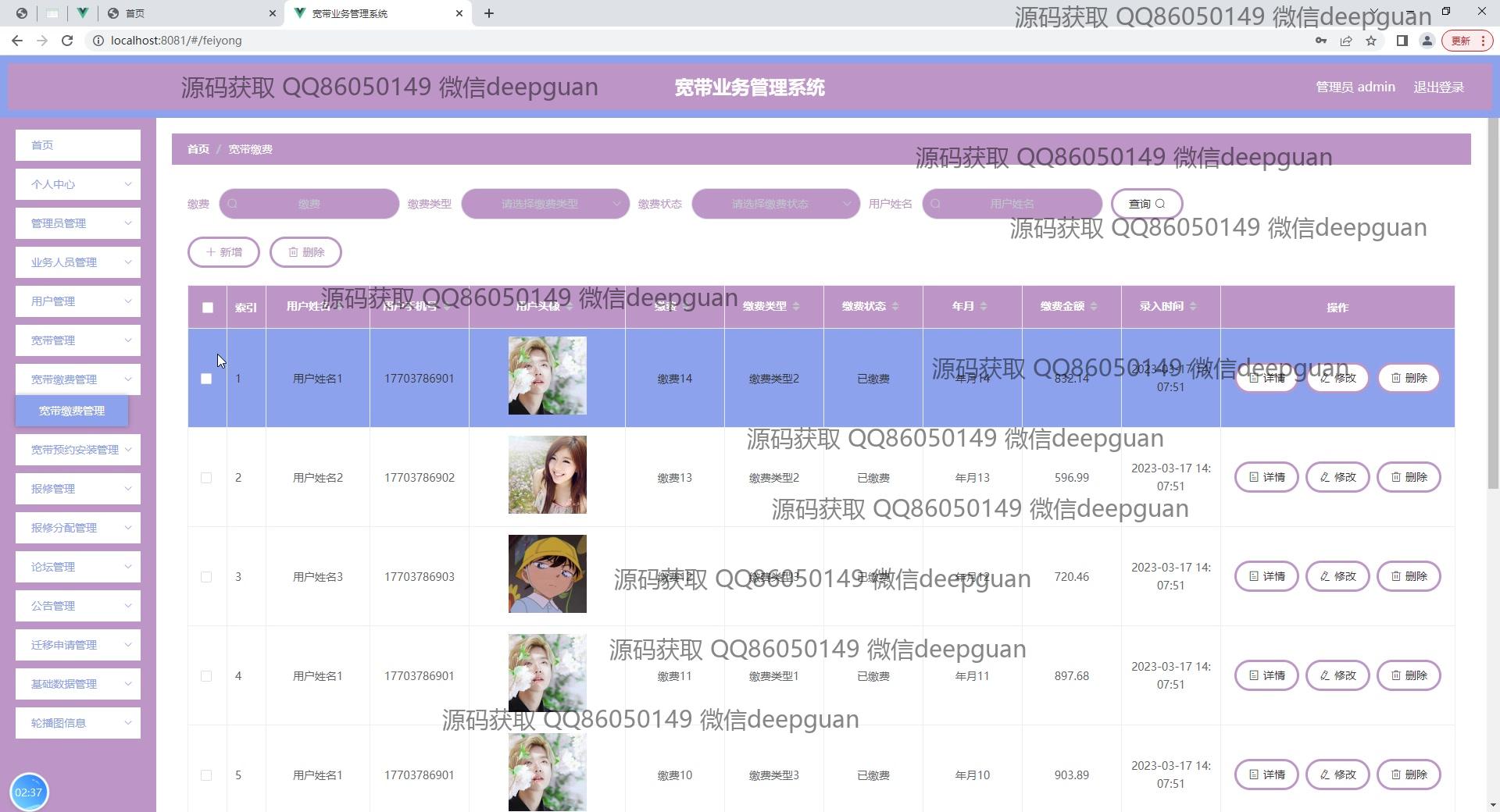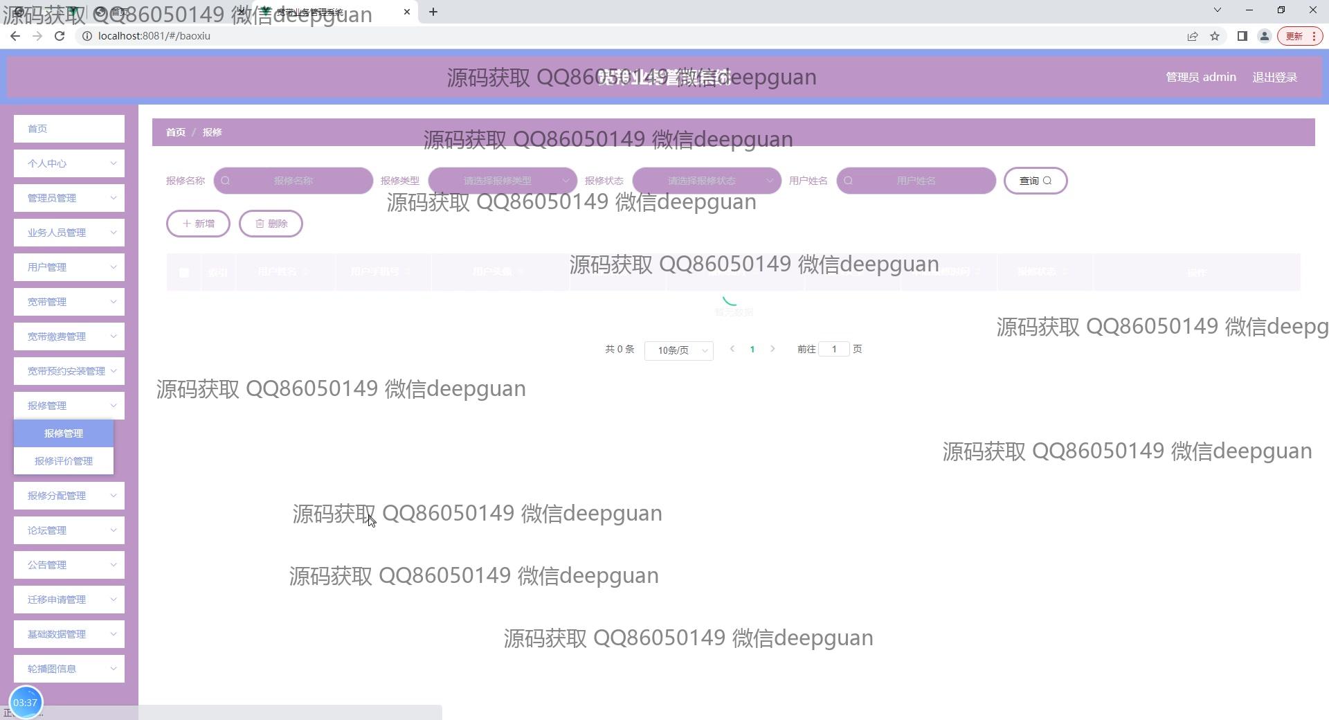 宽带业务管理系统:角色分为管理员、业务人员;功能包括用户管理、宽带管理、报修和费用管理,支持宽带服务的申请、审批和支付处理,提高运营效率和用户体验。 --计算机毕业设计源码;毕设源码;java毕业设计源码
