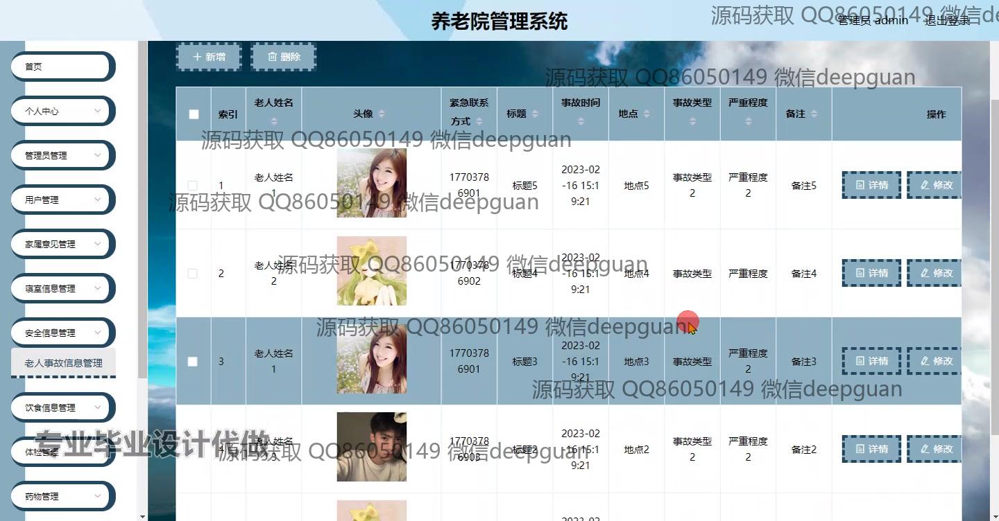 养老院管理系统:角色分为管理员、家属、老人;功能包括老人信息管理、家属意见管理、安全信息管理、饮食与药物管理、寝室分配、安全事故跟踪。 --计算机毕业设计源码;毕设源码;java毕业设计源码