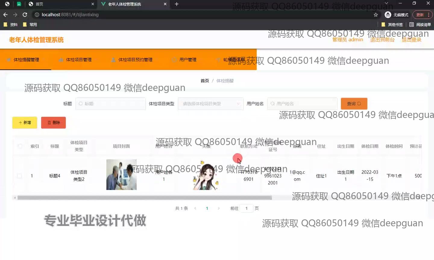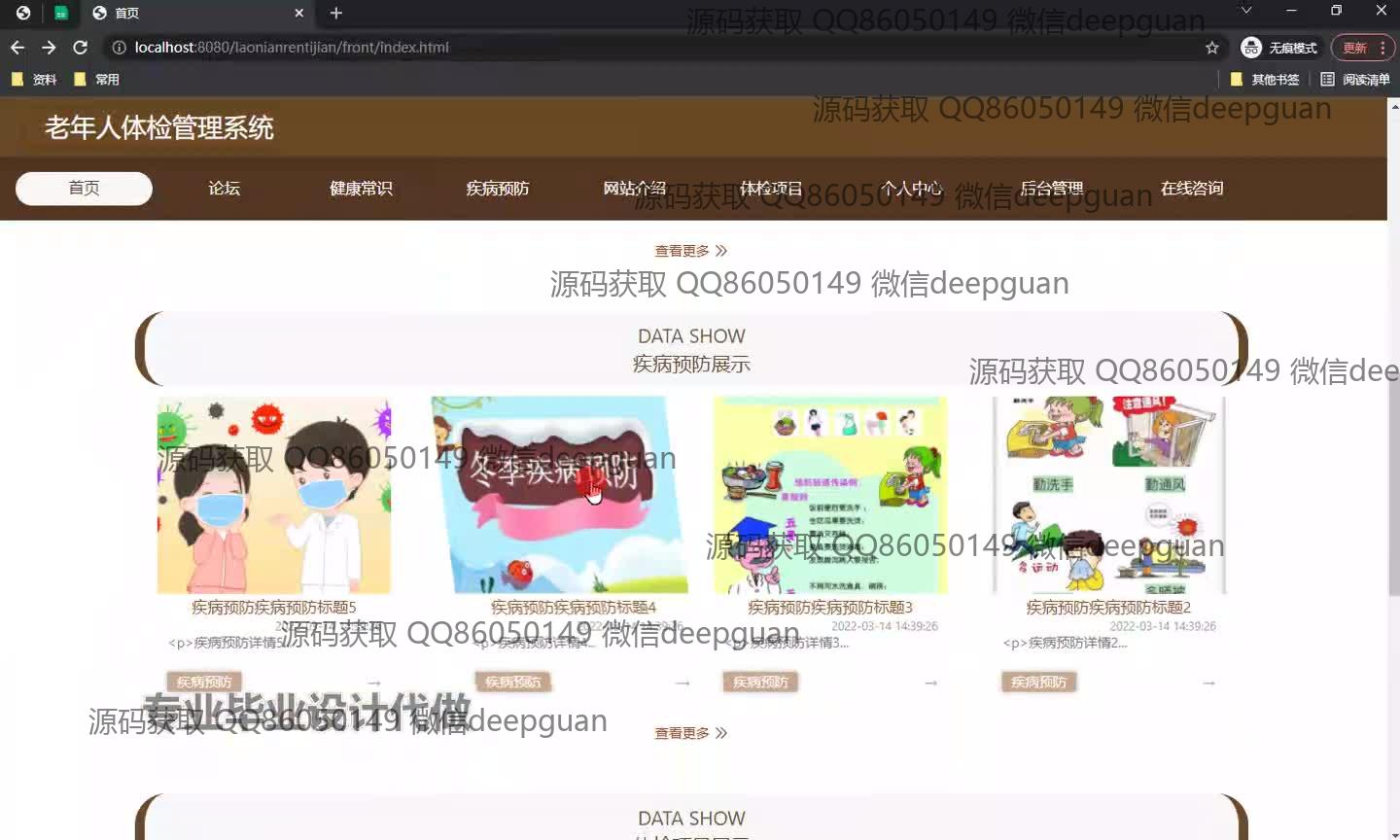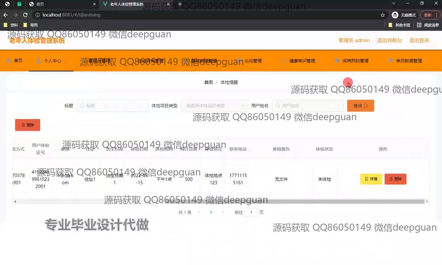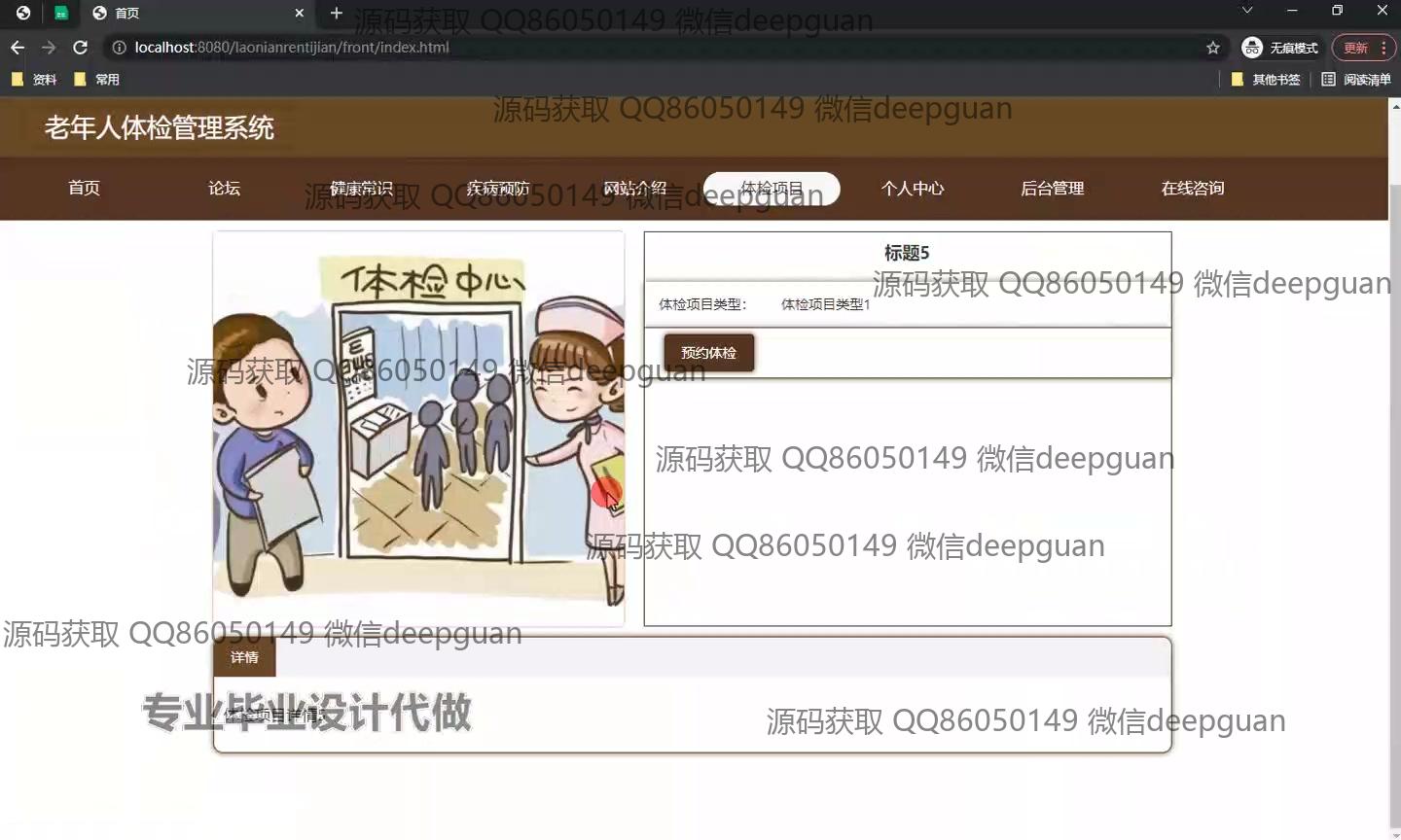 老年人体检管理系统:角色分为管理员、用户;功能包括体检预约、健康档案管理、个人信息管理、在线咨询、健康知识分享,支持便捷高效的体检和健康数据管理。 --计算机毕业设计源码;毕设源码;java毕业设计源码
