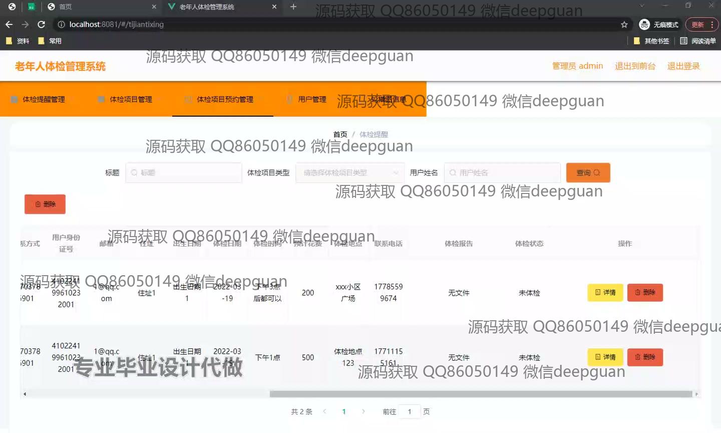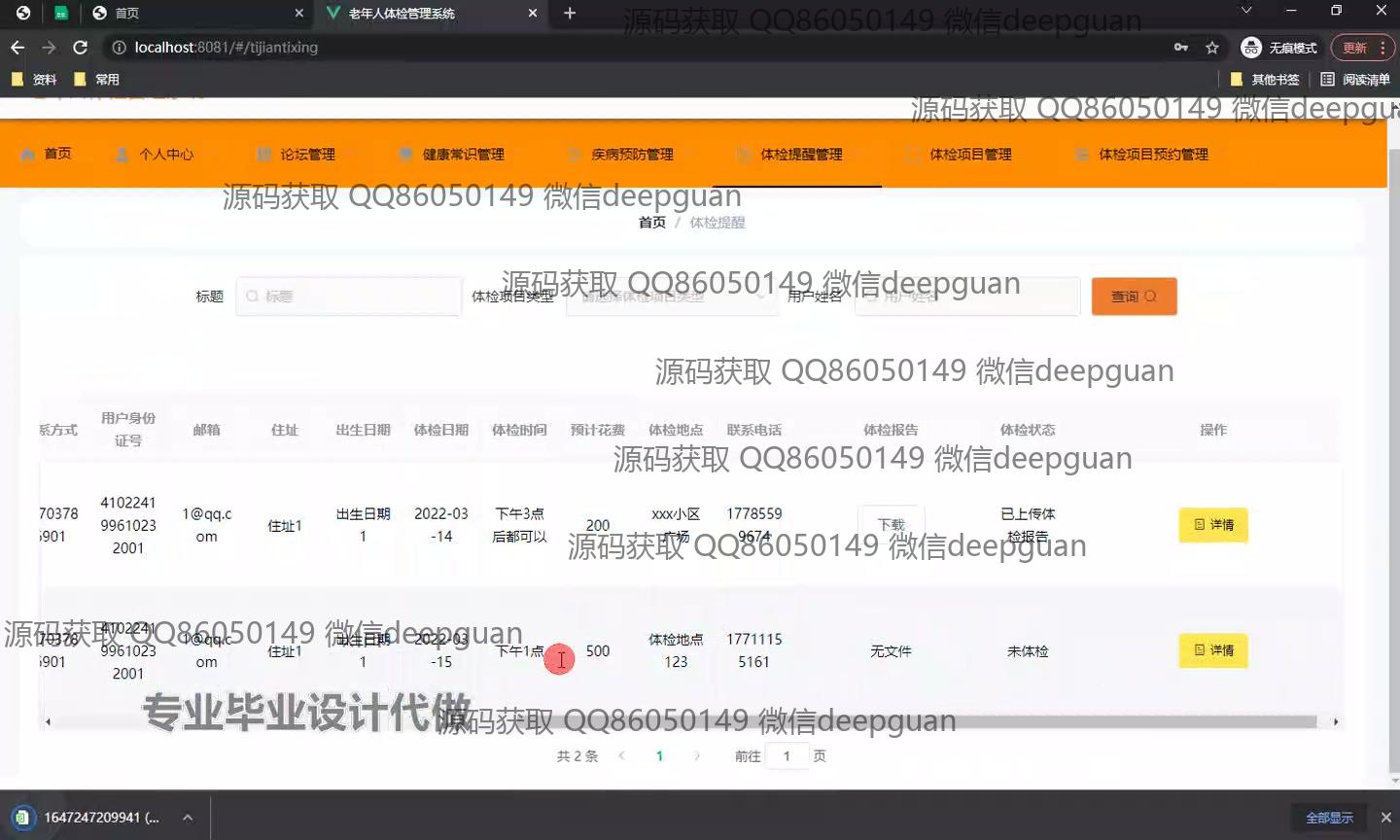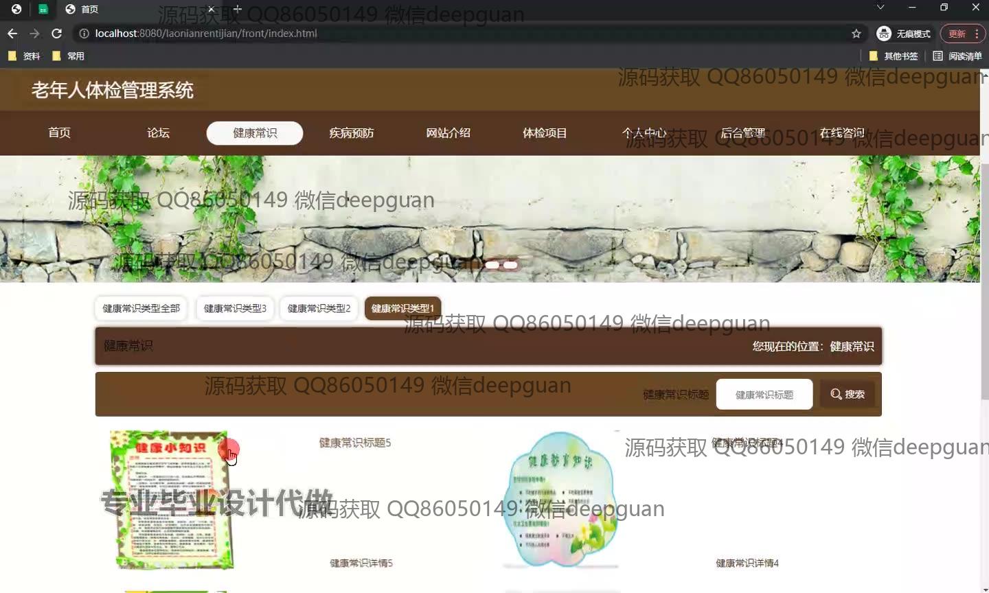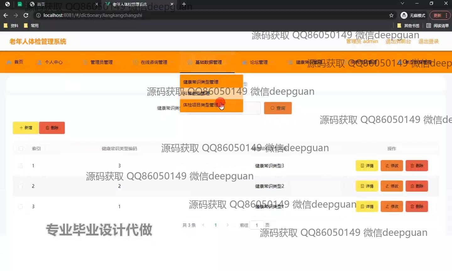 老年人体检管理系统:角色分为管理员、用户;功能包括体检预约、健康档案管理、个人信息管理、在线咨询、健康知识分享,支持便捷高效的体检和健康数据管理。 --计算机毕业设计源码;毕设源码;java毕业设计源码