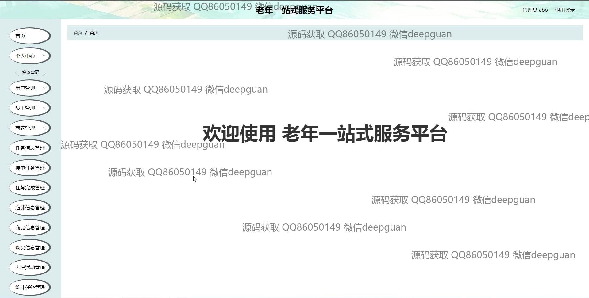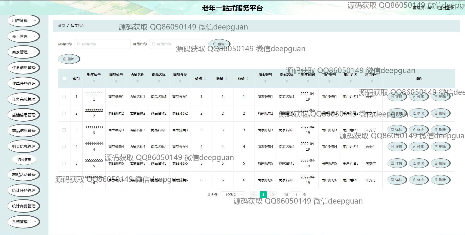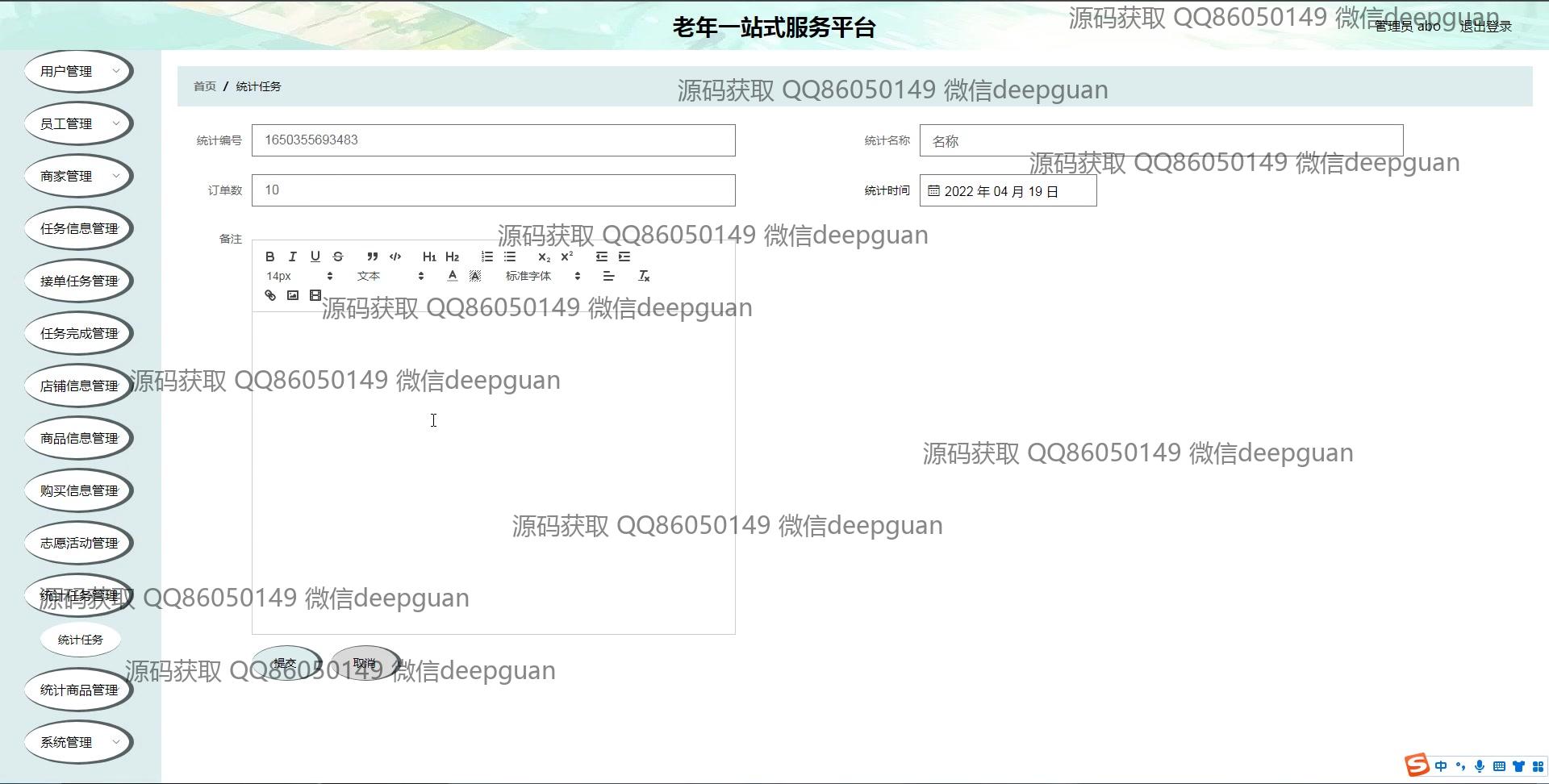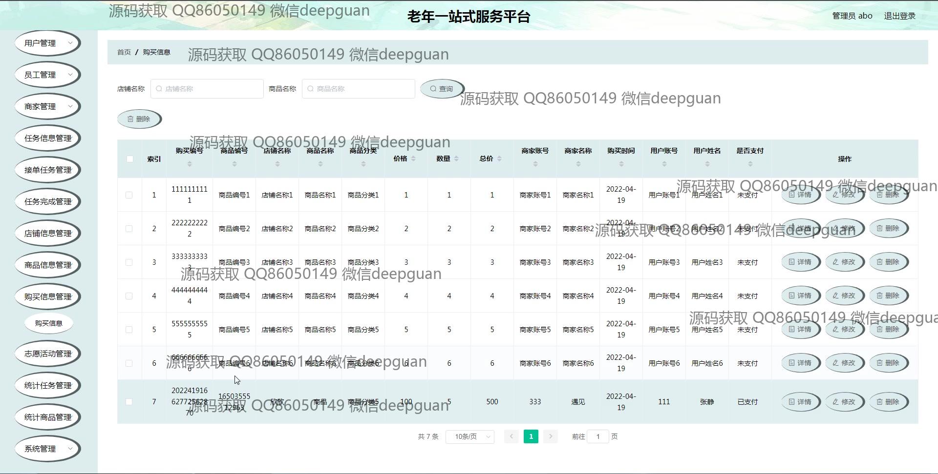 老年一站式服务平台:角色分为管理员、商家、员工;功能包括用户管理、店铺信息管理、商品信息管理、志愿活动管理、任务信息管理和购买信息管理。 --计算机毕业设计源码;毕设源码;java毕业设计源码