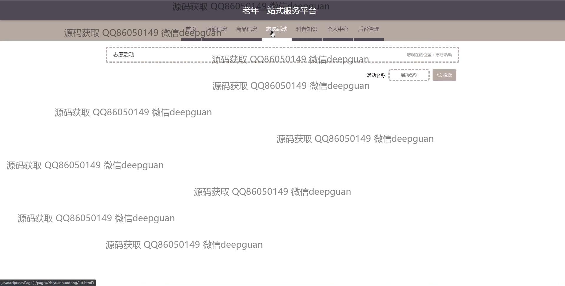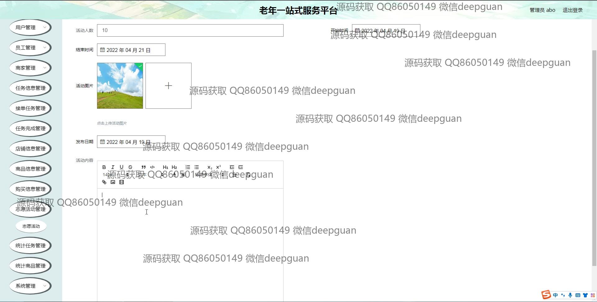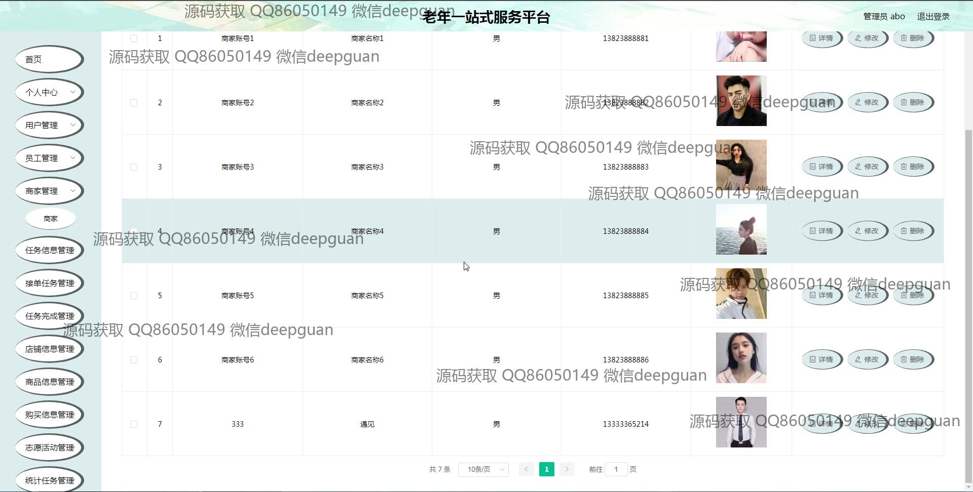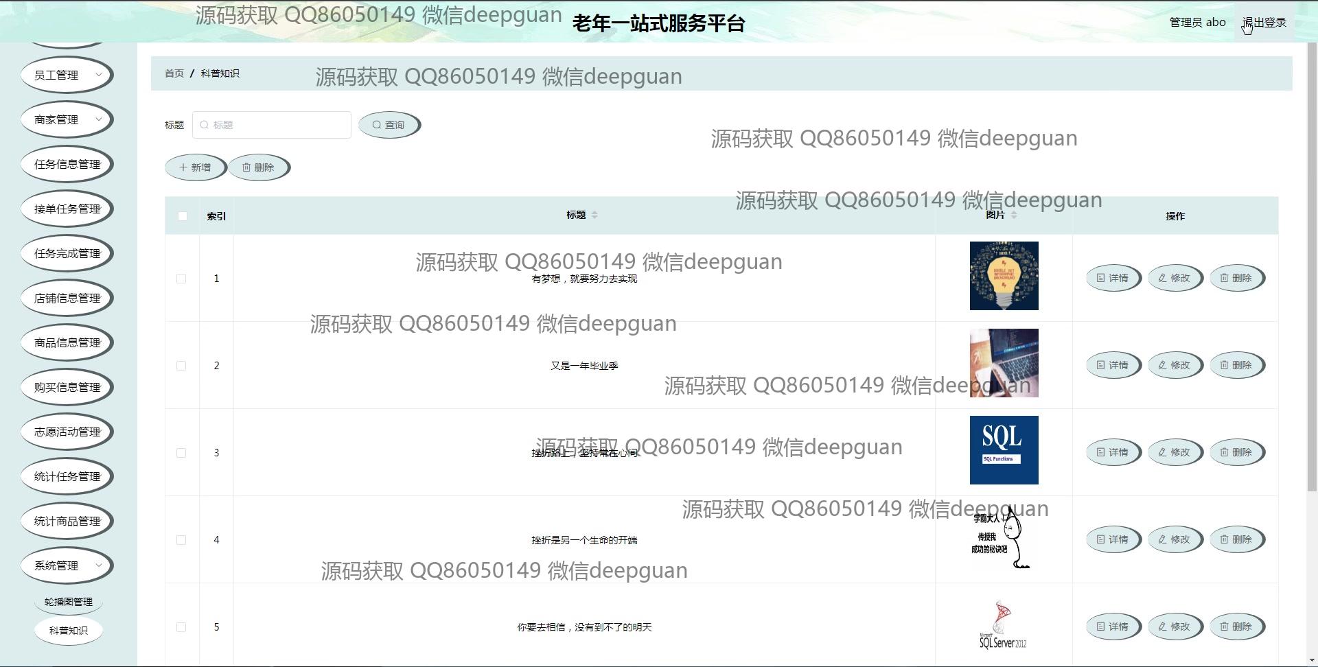 老年一站式服务平台:角色分为管理员、商家、员工;功能包括用户管理、店铺信息管理、商品信息管理、志愿活动管理、任务信息管理和购买信息管理。 --计算机毕业设计源码;毕设源码;java毕业设计源码