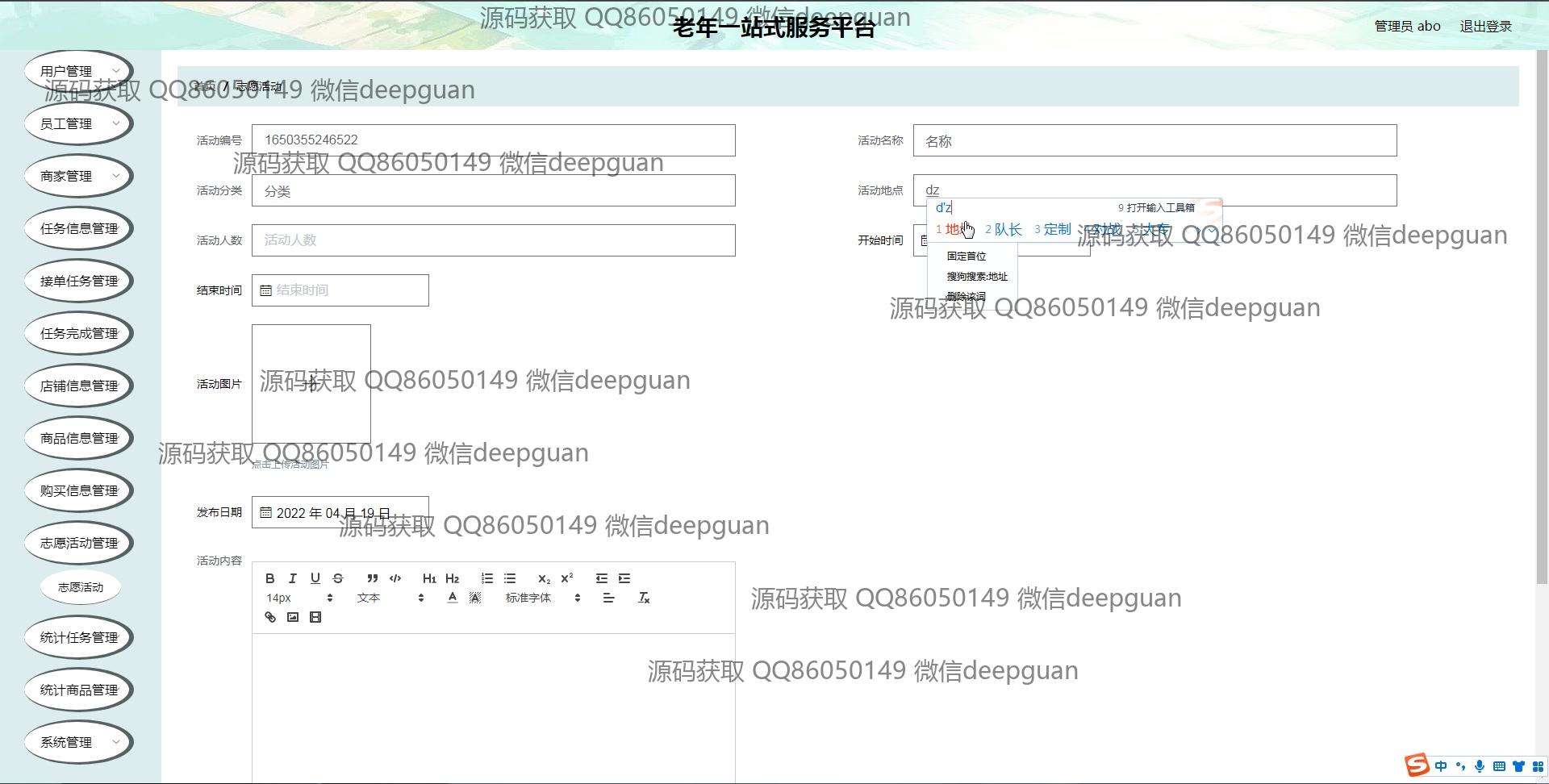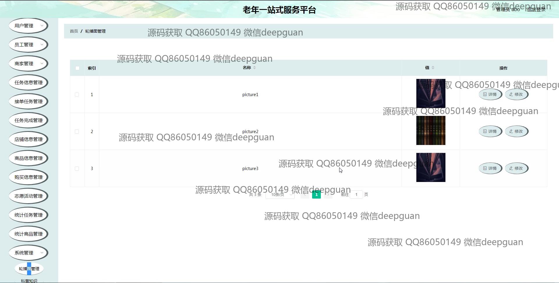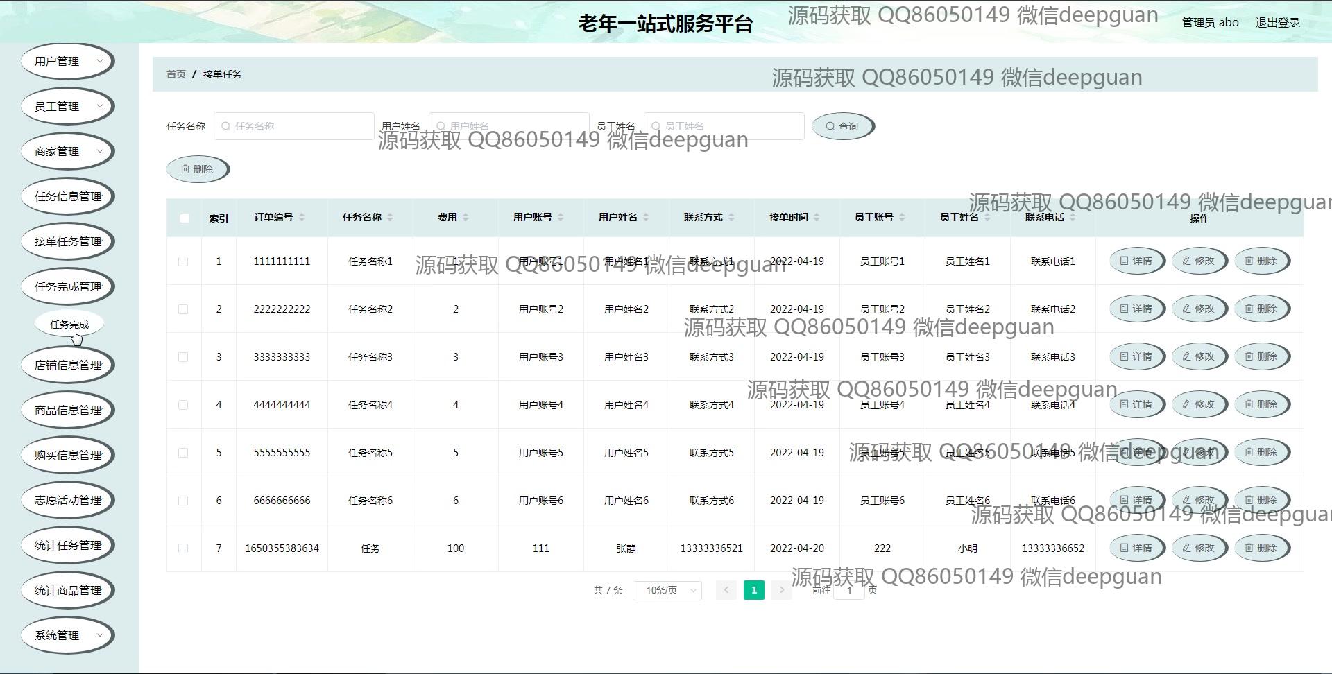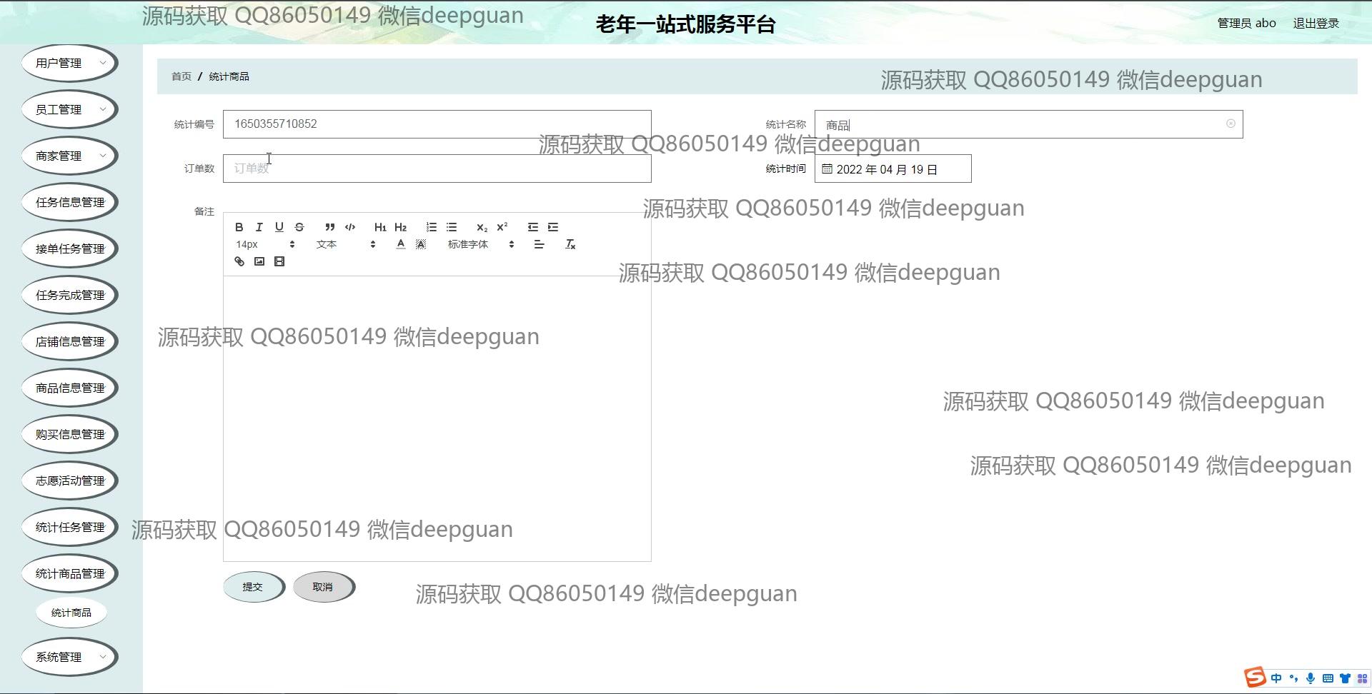老年一站式服务平台:角色分为管理员、商家、员工;功能包括用户管理、店铺信息管理、商品信息管理、志愿活动管理、任务信息管理和购买信息管理。 --计算机毕业设计源码;毕设源码;java毕业设计源码