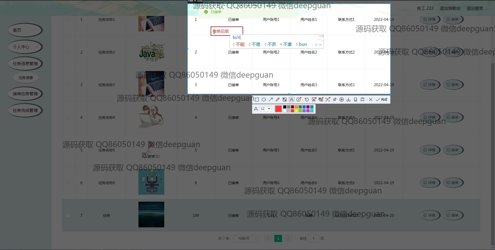 员工:员工在平台中主要涉及任务管理模块,能够查看任务列表并执行接单、任务完成及删除操作。左侧导航栏提供的个人中心和任务信息管理等功能,帮助员工进行日常任务的审核,通过任务信息表单录入和查看任务详情,包括订单编号、任务名称、用户信息及接单时间等。员工可执行注册和登录操作,在个人中心更新个人信息并进行任务的查询和筛选。操作简单明了,任务审核界面直观,支持备注输入与操作确认。
