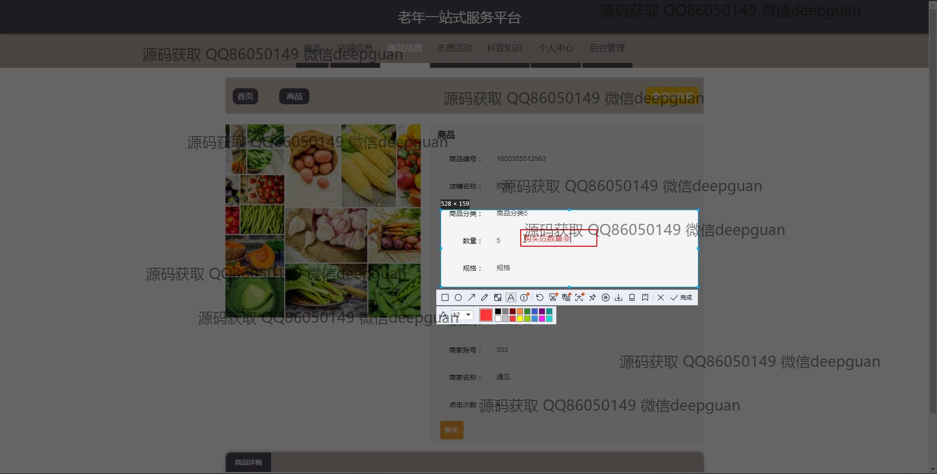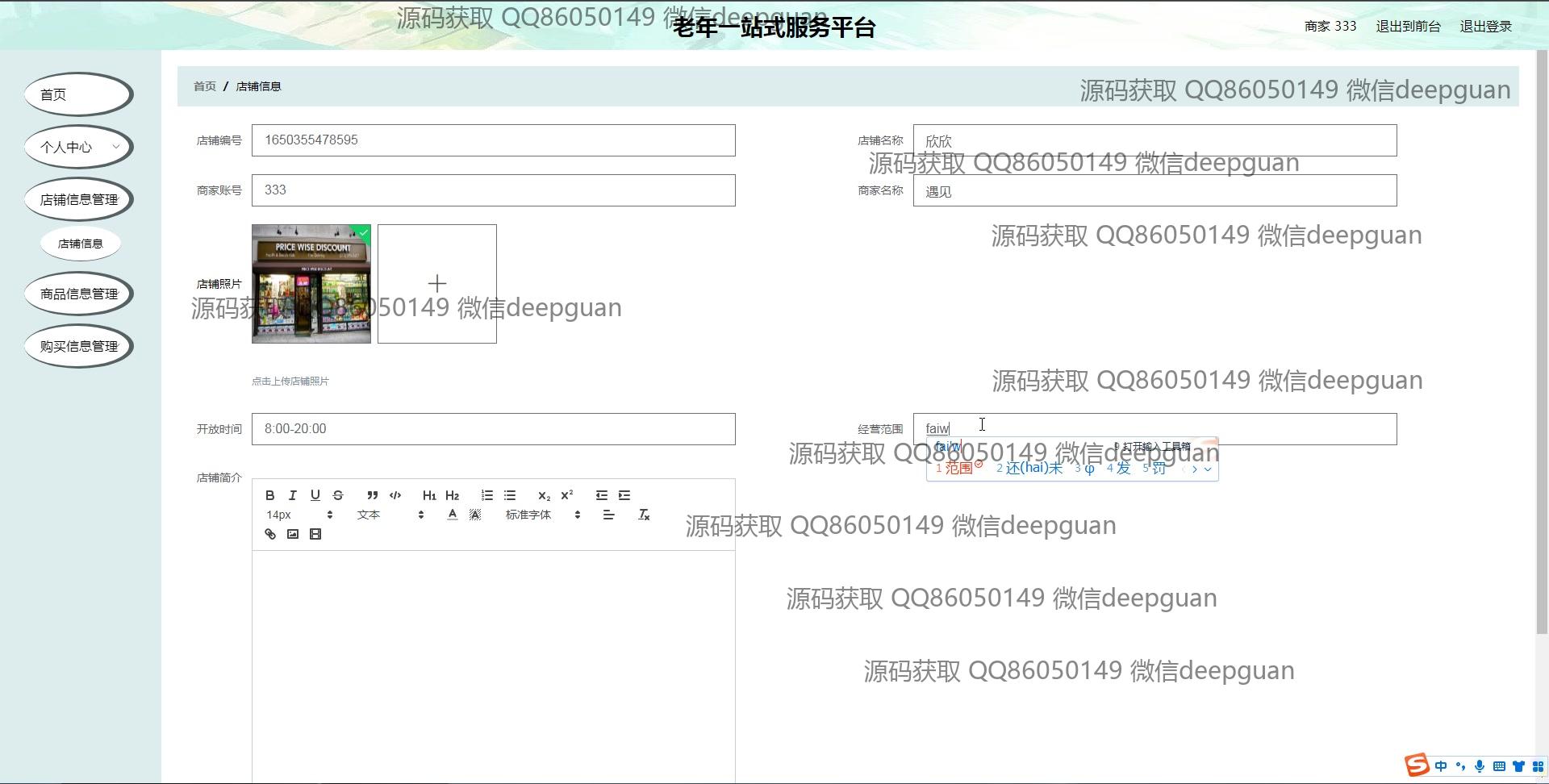 商家:商家通过平台可以管理自己的店铺信息,包括店铺编号、店铺名称、开放时间、商家账号及店铺简介。商家可以上传店铺照片,并通过导航菜单访问商品信息管理,实现商品信息的增删改查,如商品编号、数量及价格等的录入及修改。商家还可以参与志愿活动的管理,并通过平台查看订单信息和支付状态,提供订单详情的查询和编辑。商家账户可以在个人中心管理中查看和更新商家信息、店铺展示及订单详情。