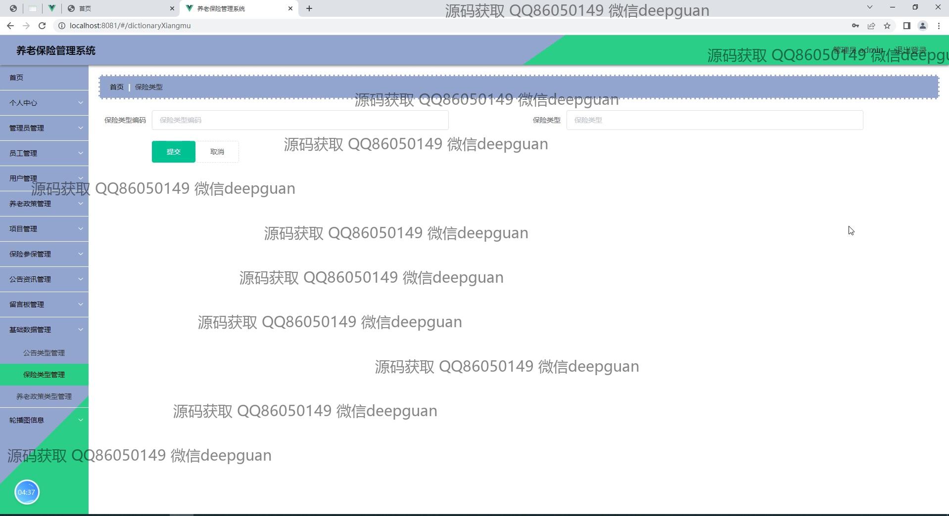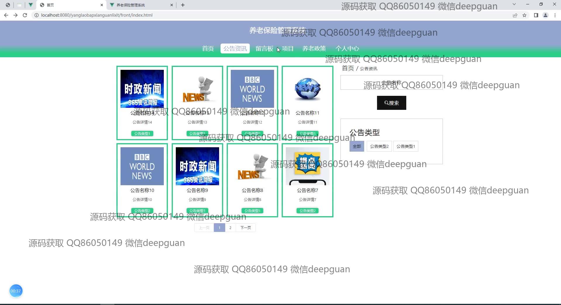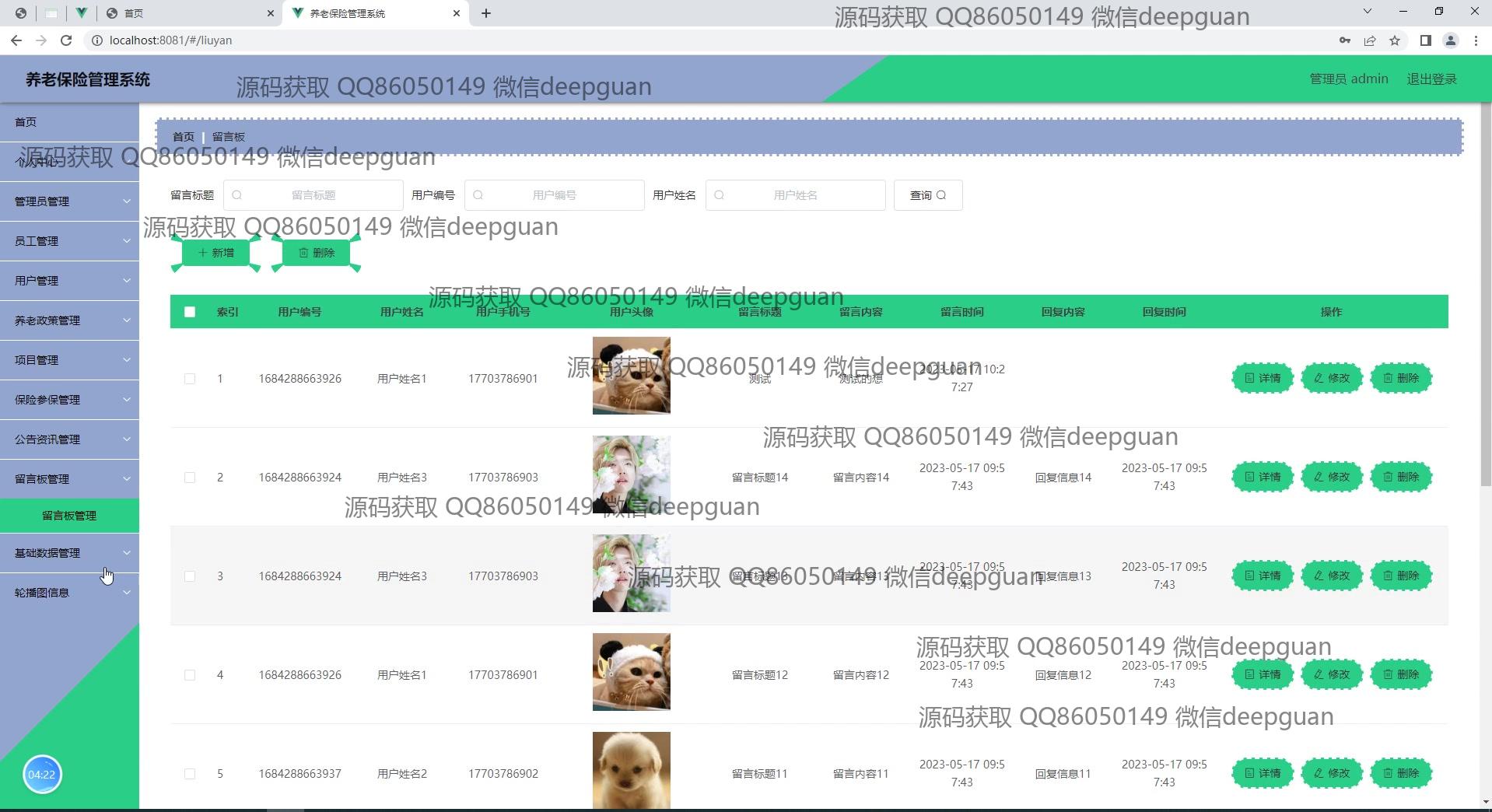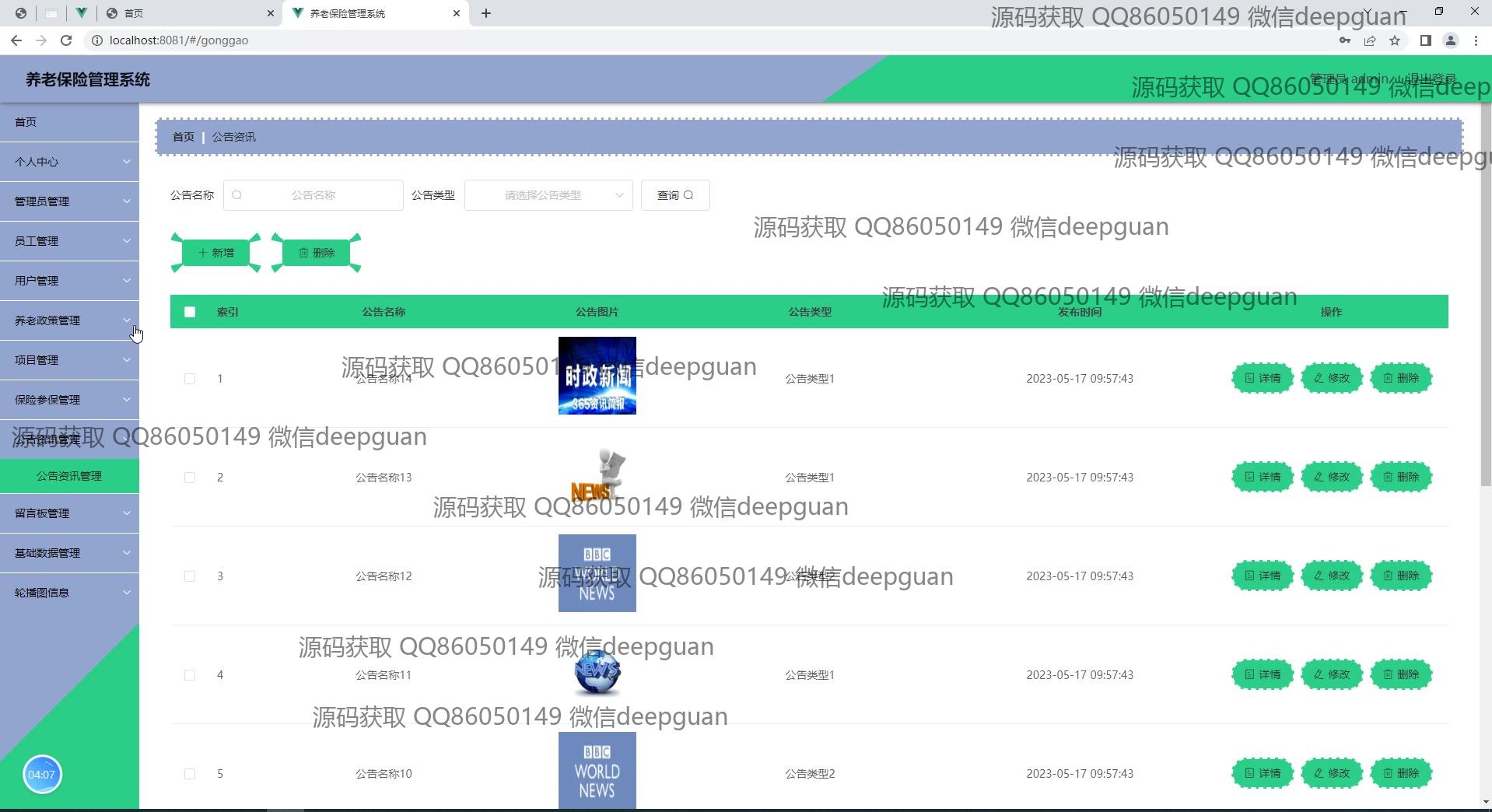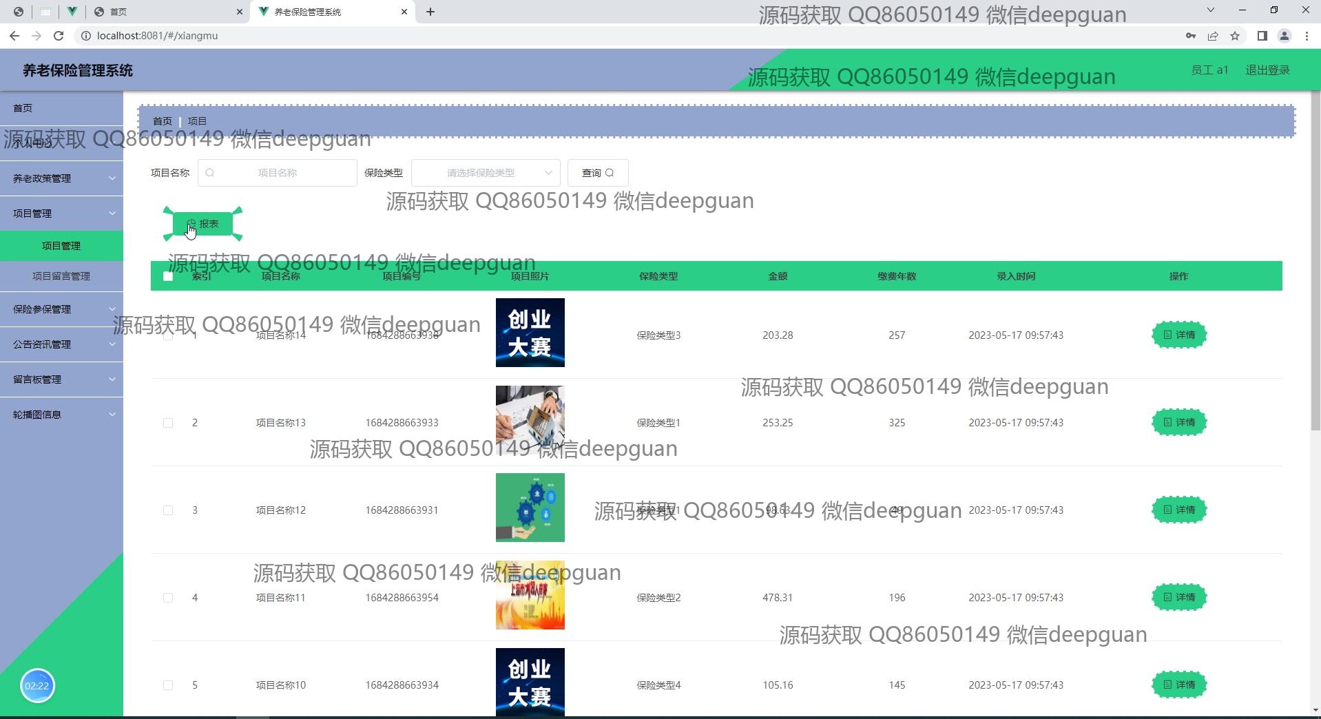 养老保险管理系统:角色分为管理员、员工;功能包括员工信息登记、用户登录、项目管理、公告资讯、留言管理、养老政策查询、保险类型管理、缴费记录查看,提供简洁直观的管理后台界面以提高管理效率。 --计算机毕业设计源码;毕设源码;java毕业设计源码
