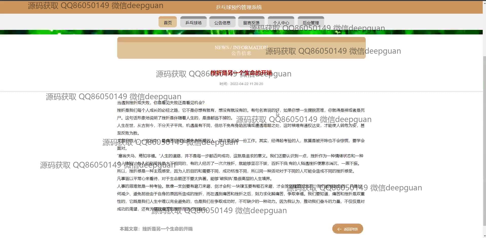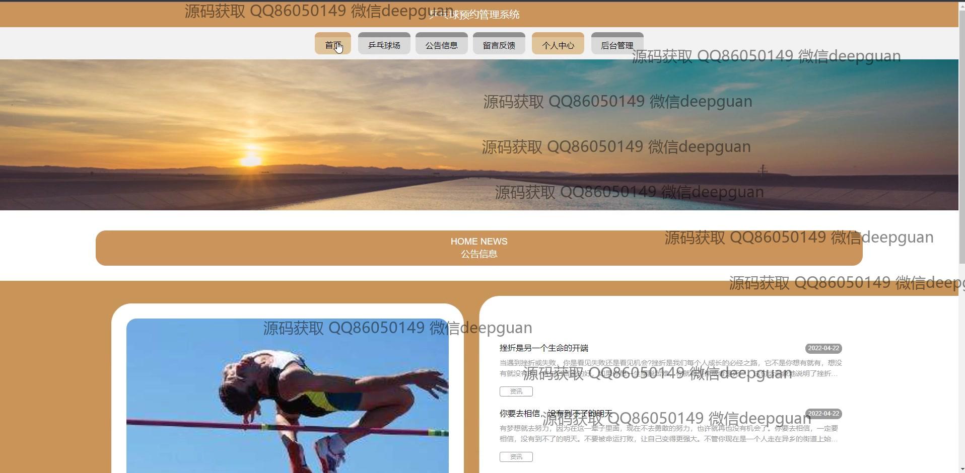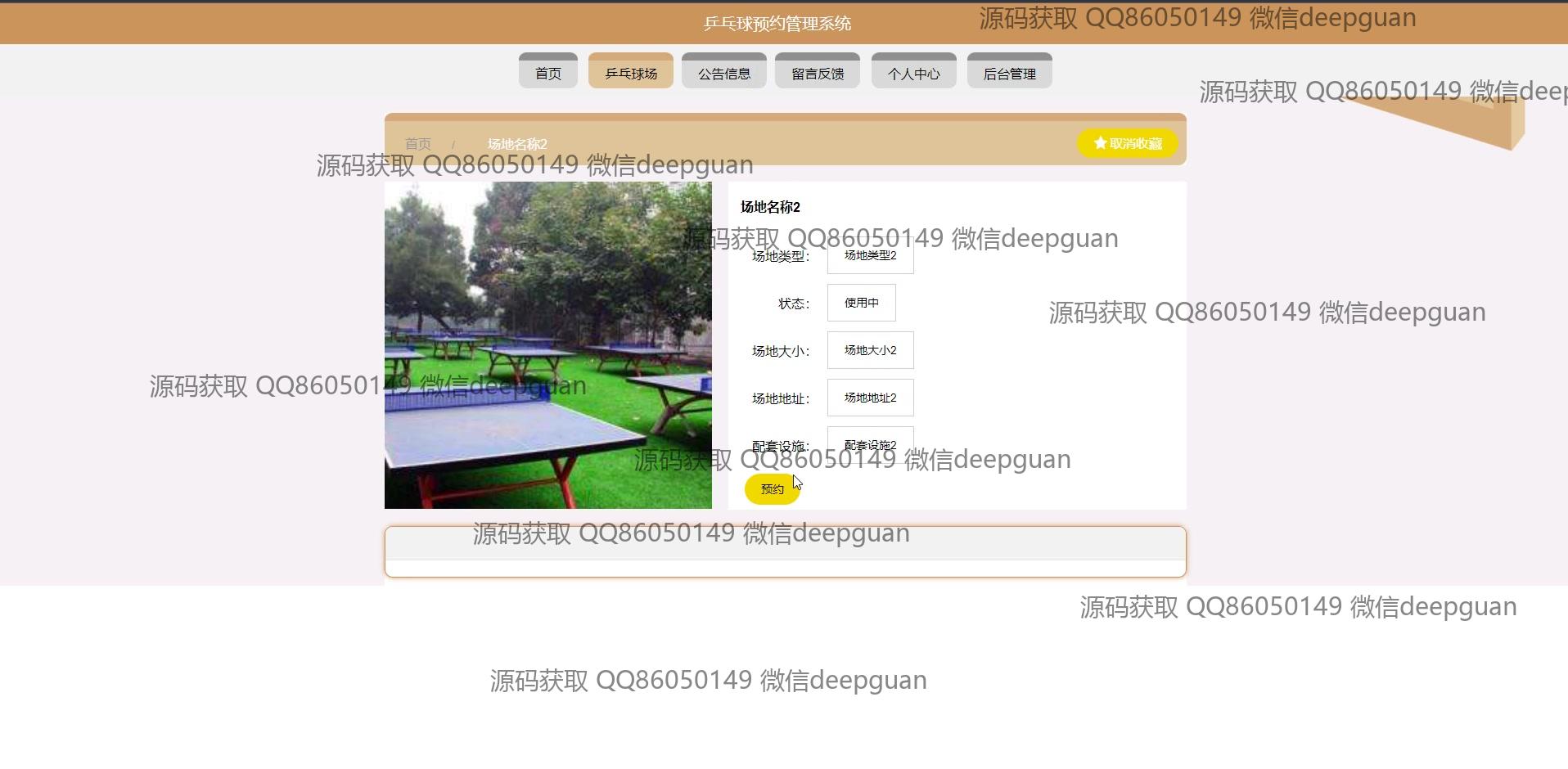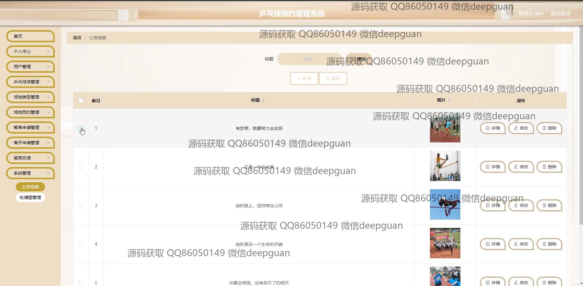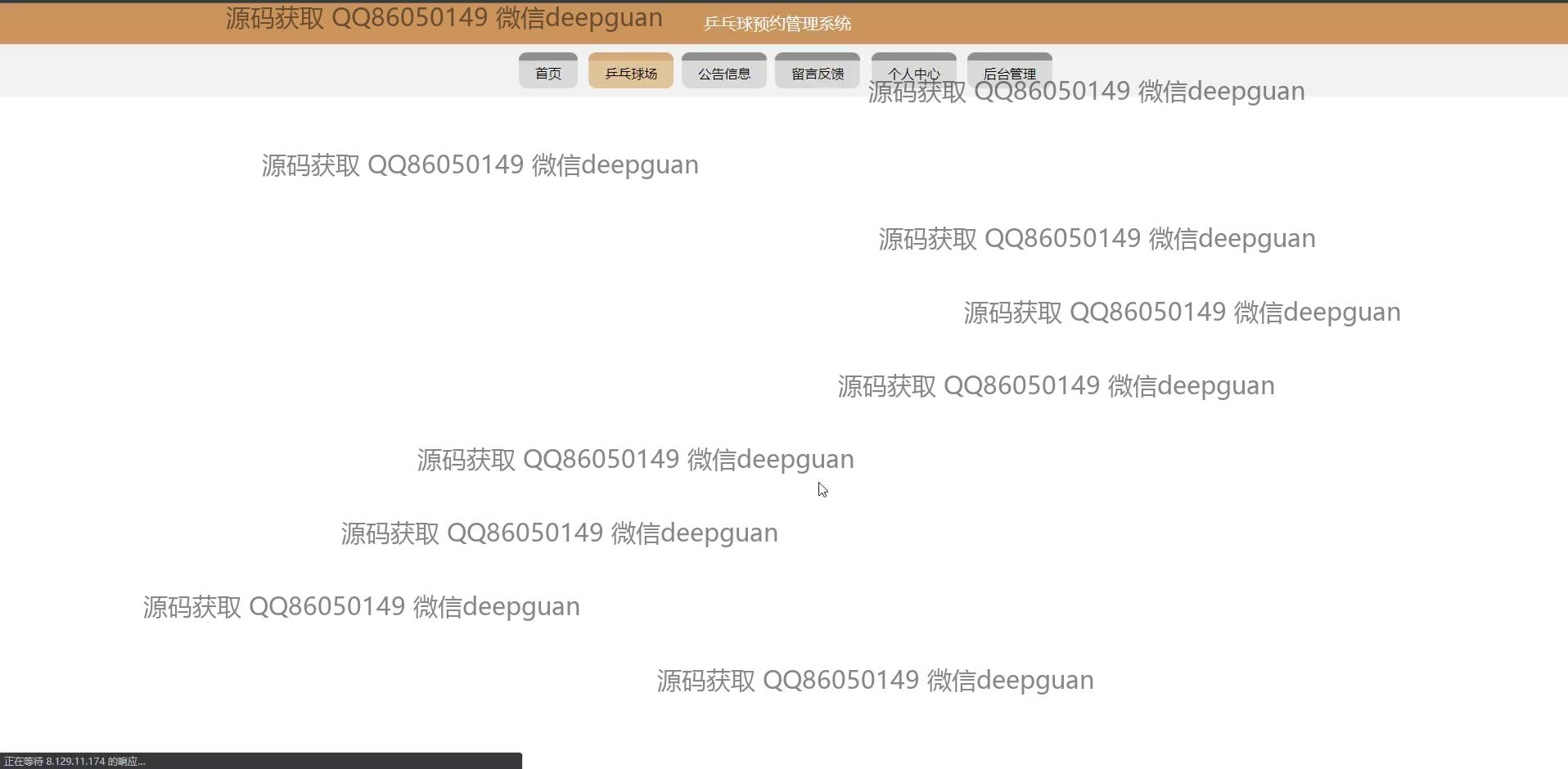 乒乓球预约管理系统:提供管理员和用户角色;功能包括场地预约、用户管理、留言反馈、公告信息、系统管理,提升用户互动和场地管理效率。 --计算机毕业设计源码;毕设源码;java毕业设计源码
