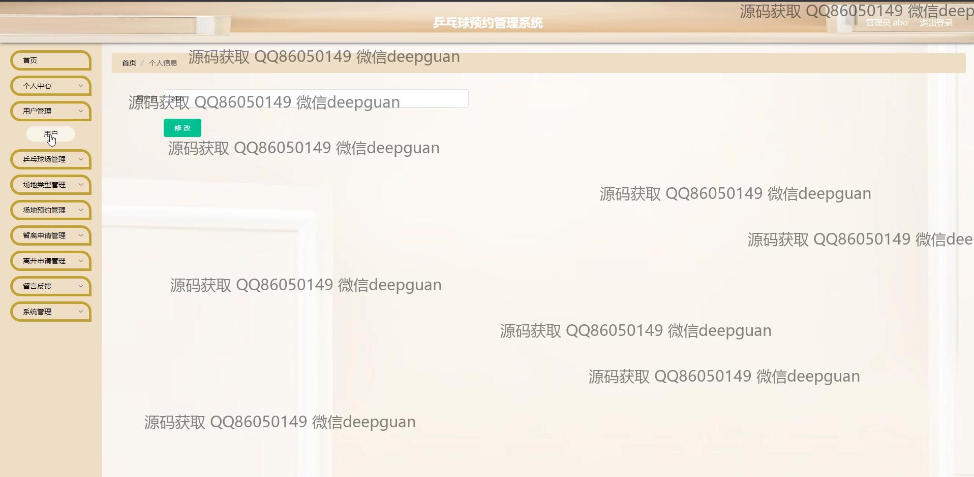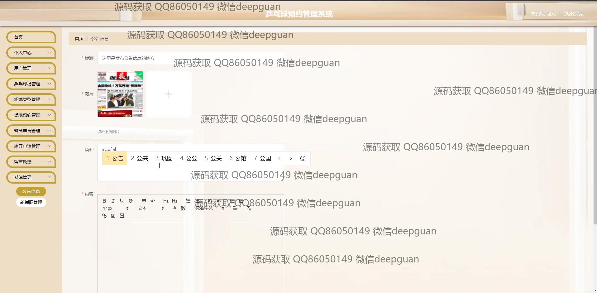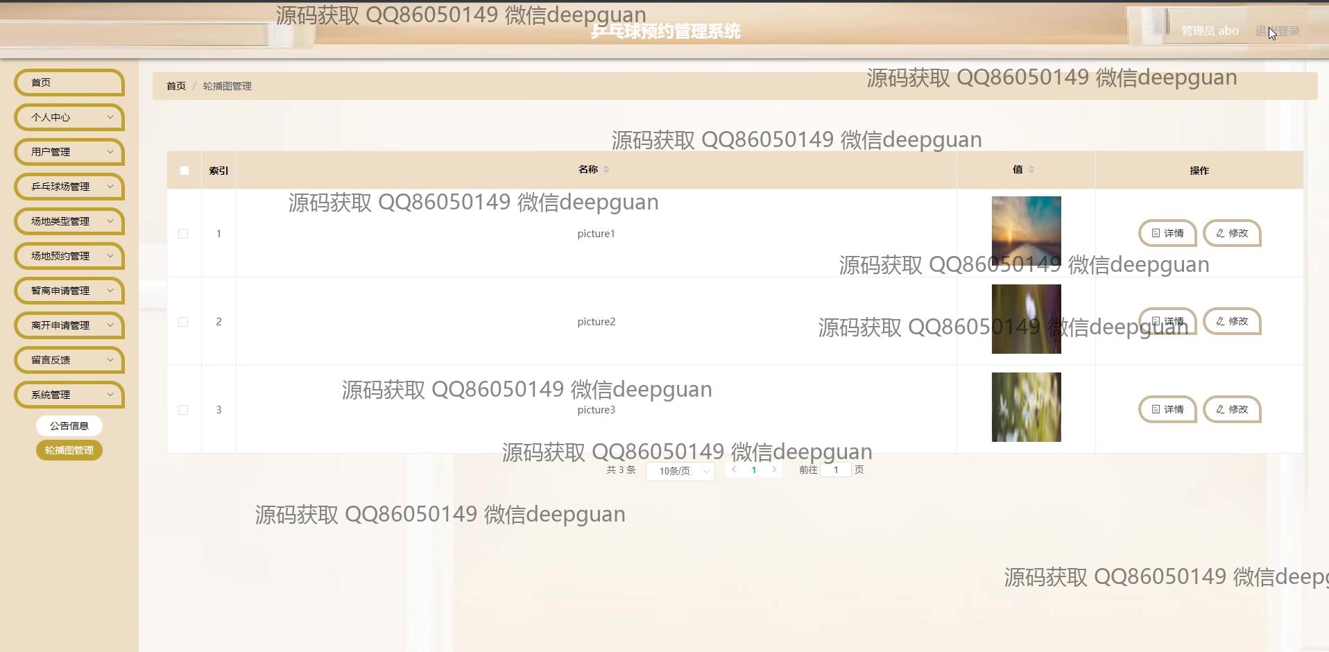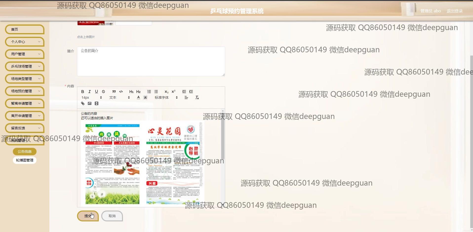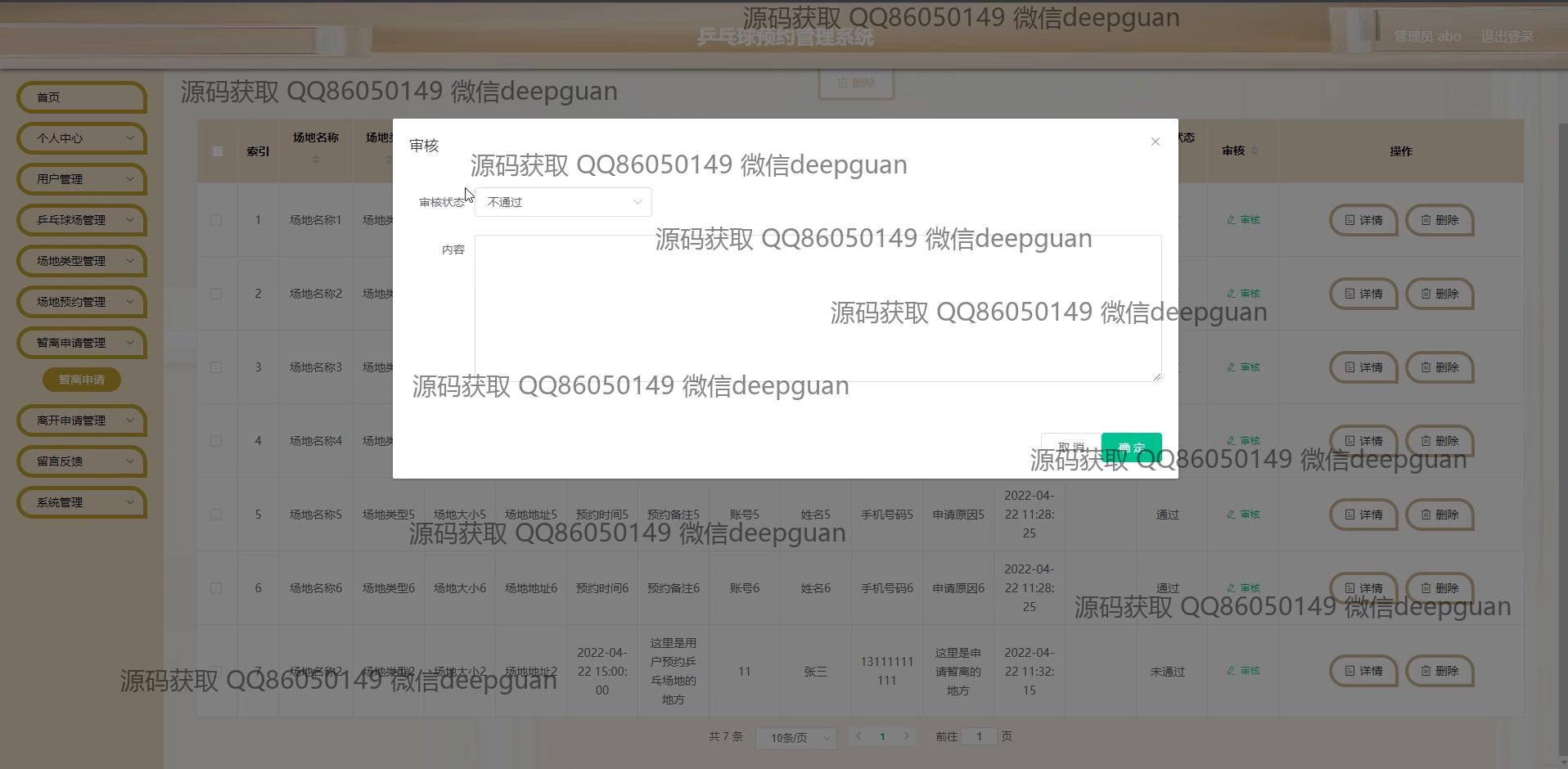 乒乓球预约管理系统:提供管理员和用户角色;功能包括场地预约、用户管理、留言反馈、公告信息、系统管理,提升用户互动和场地管理效率。 --计算机毕业设计源码;毕设源码;java毕业设计源码