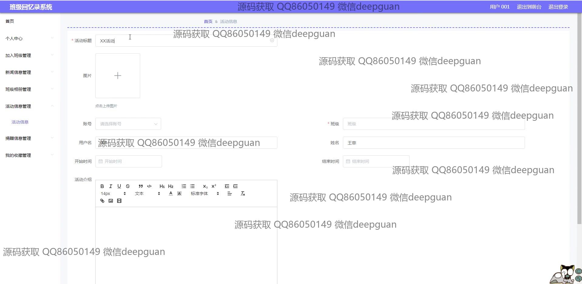 用户:用户可以注册和登录系统,并访问个人中心查看和编辑个人信息。用户具备上传和管理班级图片、参与新闻发布和评论的权限。用户可通过导航菜单快速进入班级相册、活动信息、和新闻信息模块进行浏览和交互。在班级回忆录系统中,用户可以发布班级相关新闻,编辑和更新班级回忆内容。