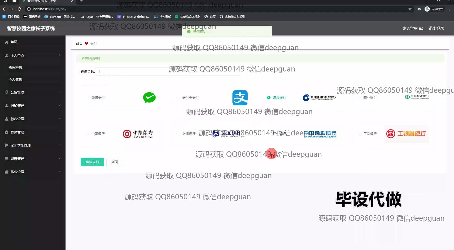 智慧校园之家长子系统:为家长提供便捷的学生信息及缴费管理,功能涵盖充值支付、考试与成绩查询、作业与课表管理、意见反馈、公告通知等,用户体验友好,易于操作。 --计算机毕业设计源码;毕设源码;java毕业设计源码