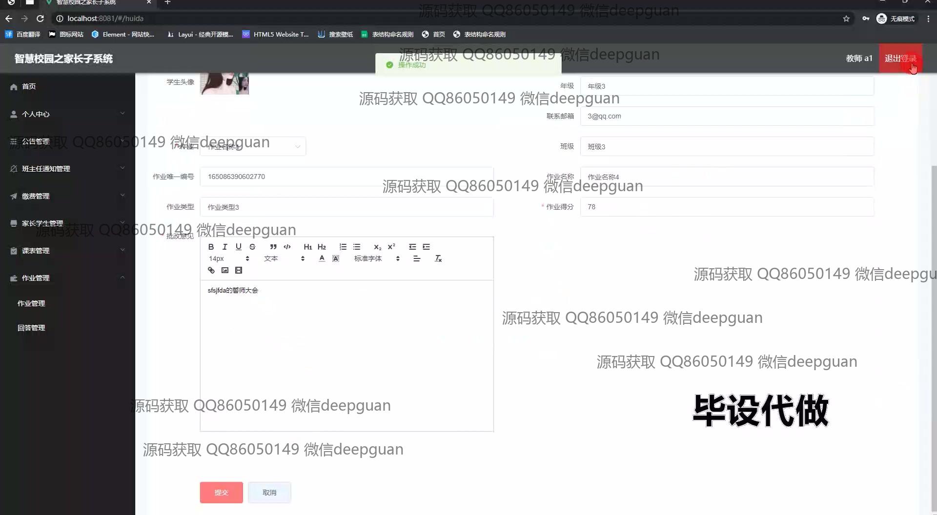 教师:可通过系统管理和分发教学任务、查看和录入学生成绩、以及通知管理来支持教学活动。教师也参与作业管理,制定作业类型和管理学生提交的作业。评分和作业反馈等功能实现教师与家长间的交流互动。