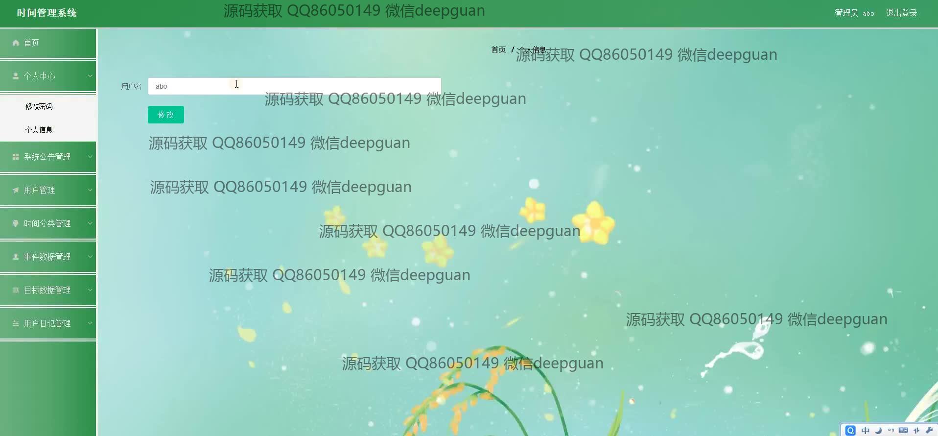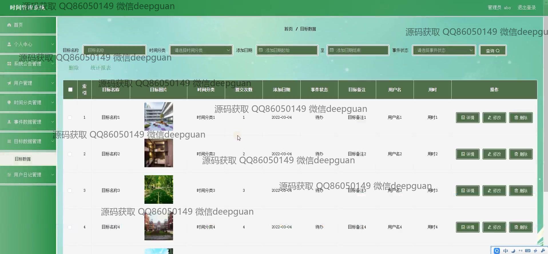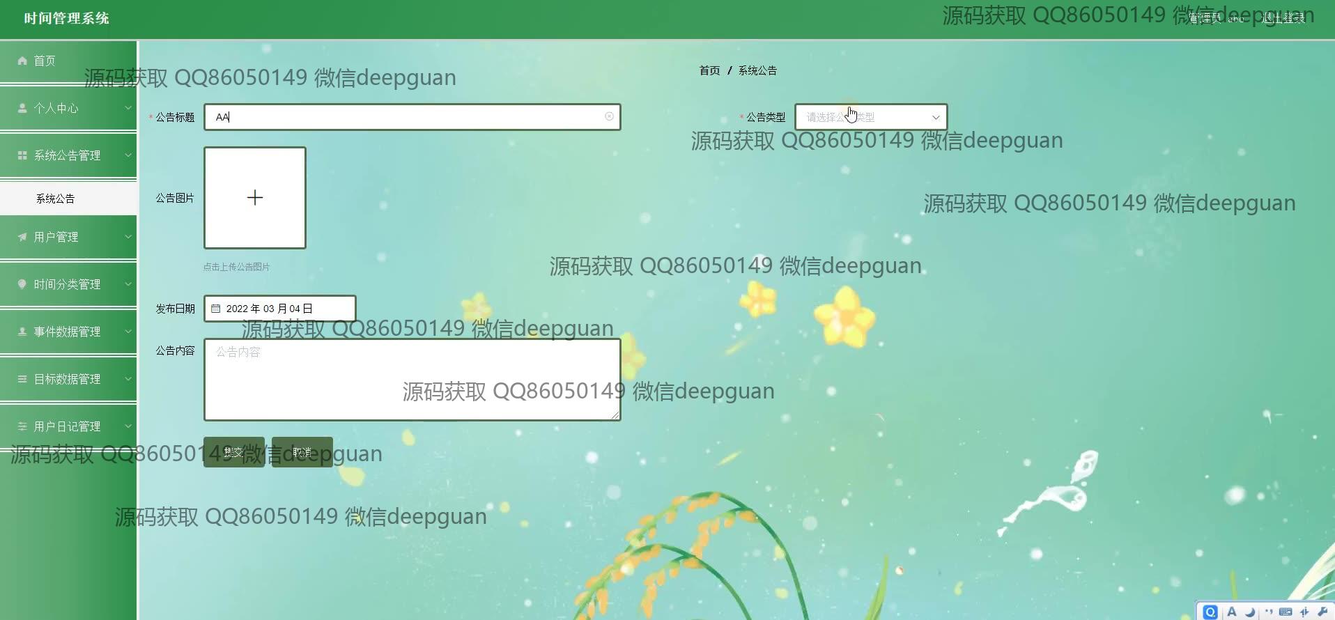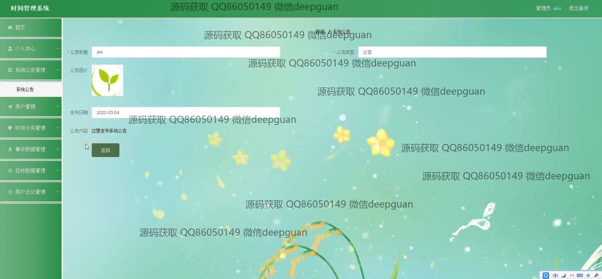 时间管理系统:角色分为管理员、用户;用户注册、任务管理、公告发布、用户信息管理等功能,简化日常事件管理,提高工作效率,界面简洁,用户体验友好。 --计算机毕业设计源码;毕设源码;java毕业设计源码