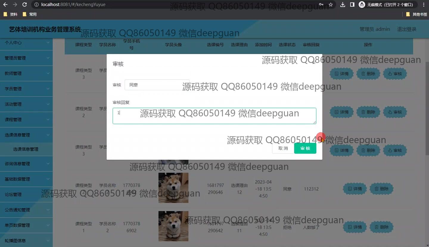 艺体培训机构业务管理系统:角色包括管理员、教师、学员;核心功能涵盖学员信息管理、课程安排、教师管理、在线报名、活动留言、公告通知等模块,支持课程审核与统计报表功能。 --计算机毕业设计源码;毕设源码;java毕业设计源码