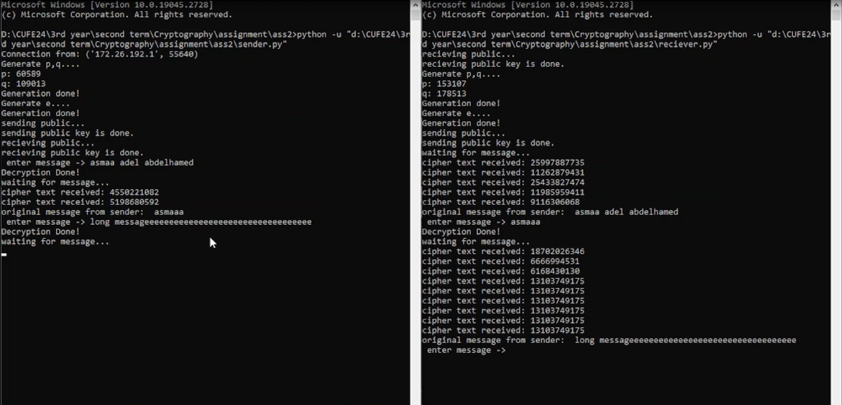 Cryptography project includes communication between sender and receiver with RSA encryption algorithm and breaking it with CCA (chosen cipher attack) and mathematical attack using python socket.