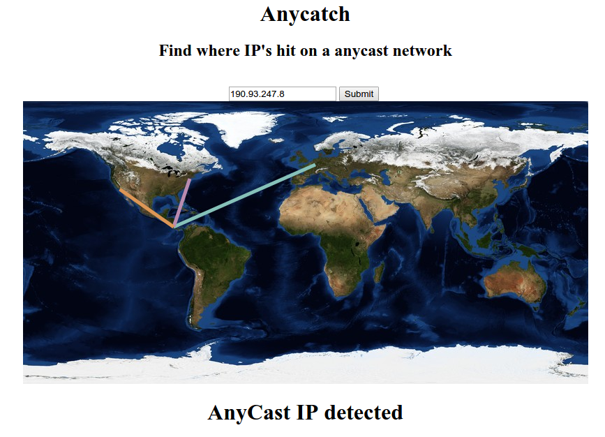<h3>Discovery of users destination in regards to an anycast IP</h3> This is normally a hard task for providers who use anycast, since you cannot guess where providers are going to route, since you cannot see their routing table or how their routers are configured in terms of what they have their metrics set to. They can only assume, For example “French IP addresses will hit the French announcement of the IP address”. This is not always true, this is amplified more in regions of bad connectivity that have lesser connectivity than other regions, because they will end up buying off carriers that go direct to regions like Europe and North America where connectivity is better. Where a user ends up if they try and contact an anycast IP depends on who their ISP is buying their greater connectivity off. However, The provider can use their own anycast network to test where the user will end up, assuming that the target replies back when sent something (ICMP Echo, TCP SYN) you can listen back for the response. You don’t need to worry about where on the anycast network you send the probe, all you need to do is listen back for the response. This works fine, as long as the target itself not an anycast address (and you can detect that as I have written above, by sending out from many nodes at once and seeing if the responses land back at different places) <h3>PoC</h3> I have a set of 3 servers (One on West Coast USA, East Coast USA, and one in Luxembourg, EU) that are setup to be any casted, and have assembled an anycast network out of the three servers. Here is it detecting an anycast IP:and here is it testing against a set of unicast destinations: University of Sydney: