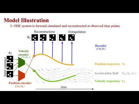 <p align="center"> <img align="middle" src="images/ode2vae-anim.gif" alt="model architecture" width="1000"/> </p>We tackle the problem of learning low-rank latent representations of possibly high-dimensional sequential data trajectories. Our model extends Variational Auto-Encoders (VAEs) for sequential data with a latent space governed by a continuous-time probabilistic ordinary differential equation (ODE). We propose