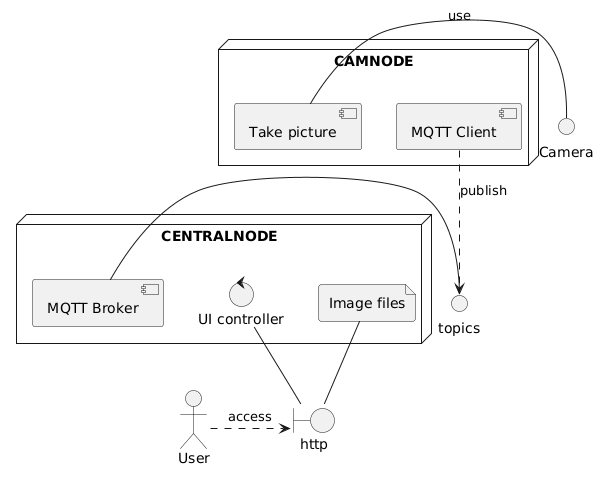 Technically, the camera Raspberry Pis connect to a centralnode via MQTT publish/subscribe message queues. The centralnode collects all images and logging information. The user accesses the image files and operates the scanner through a web browser. The following UML diagram depicts the system design.