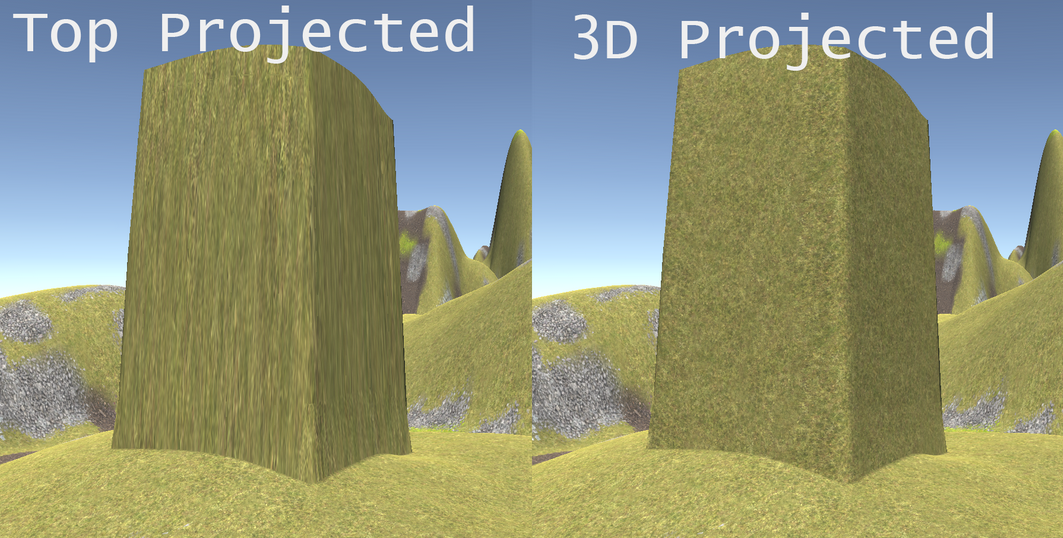 Here the custom texture is an R8G8B8A8 index map, used as a replacement for the splatmaps. The index map provides control of not only the material, but also the 3D texture projection, rotation, and weight.