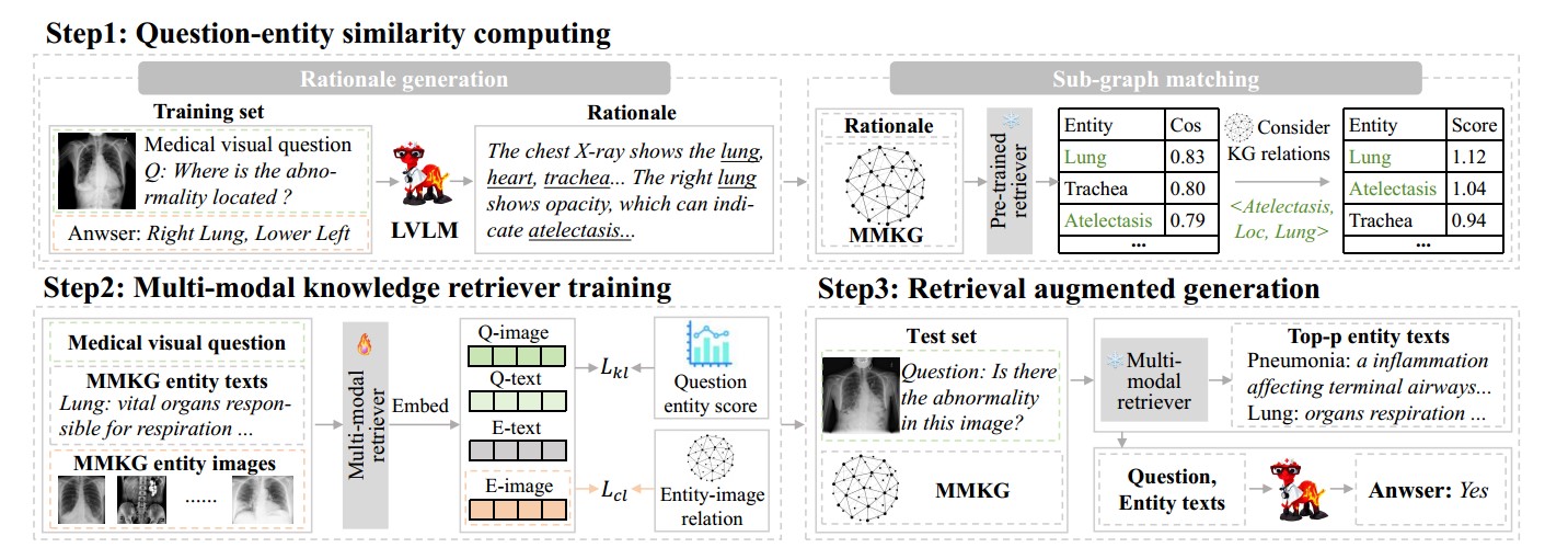 We propose a MKGF framework that leverages a multi-modal medicaknowledge graph (MMKG) to relieve the hallucination issue without fine-tuning the abundant parameters of LVLMs. Firstly, we employ a pre-trained text retriever to build question-knowledge relations on training set. Secondly, we train a multi-modal retriever with these relations. Finally, we use it to retrieve question-relevant knowledge and enhance the performance of LVLMs on the test set. To evaluate the effectiveness of MKGF,we conduct extensive experiments on two public datasets Slake and VQA-RAD.