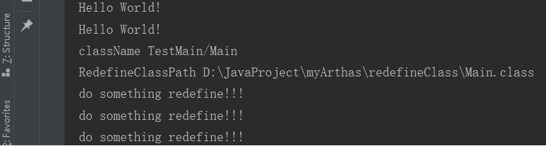 String vmPid = "21268"; String agentJarPath = "D:\\JavaProject\\myArthas\\target\\myArthas-1.0-SNAPSHOT-shaded.jar"; VirtualMachine virtualMachine = VirtualMachine.attach(vmPid); virtualMachine.loadAgent(agentJarPath, "D:\\JavaProject\\myArthas\\redefineClass\\Main.class"); virtualMachine.detach();实现效果