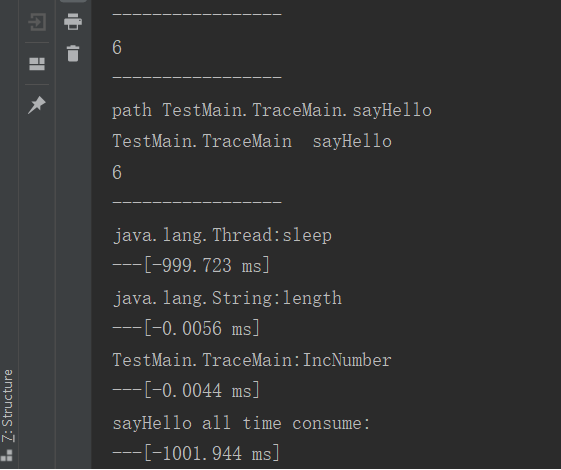 String vmPid = "16248"; String agentJarPath = "D:\\JavaProject\\myArthas\\target\\timetunnel.jar"; VirtualMachine virtualMachine = VirtualMachine.attach(vmPid); virtualMachine.loadAgent(agentJarPath, "TestMain.TimeTunnelMain.sayHello"); virtualMachine.detach();实现效果