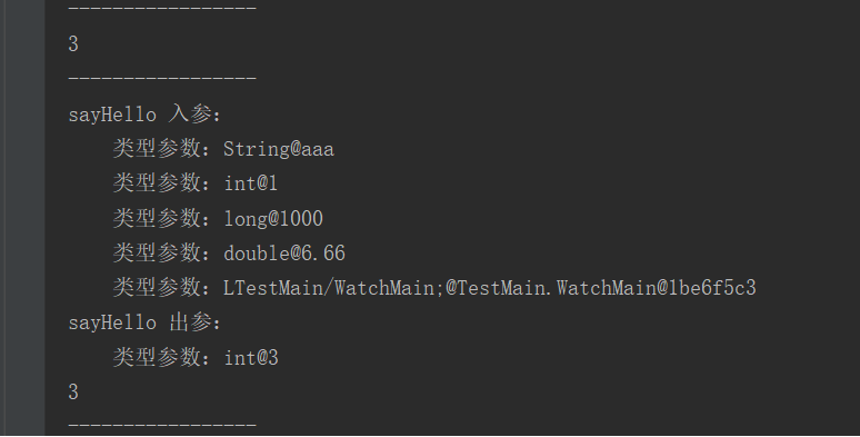 String vmPid = "19432"; String agentJarPath = "D:\\JavaProject\\myArthas\\target\\watch.jar"; VirtualMachine virtualMachine = VirtualMachine.attach(vmPid); virtualMachine.loadAgent(agentJarPath, "TestMain.WatchMain.sayHello"); virtualMachine.detach();实现效果