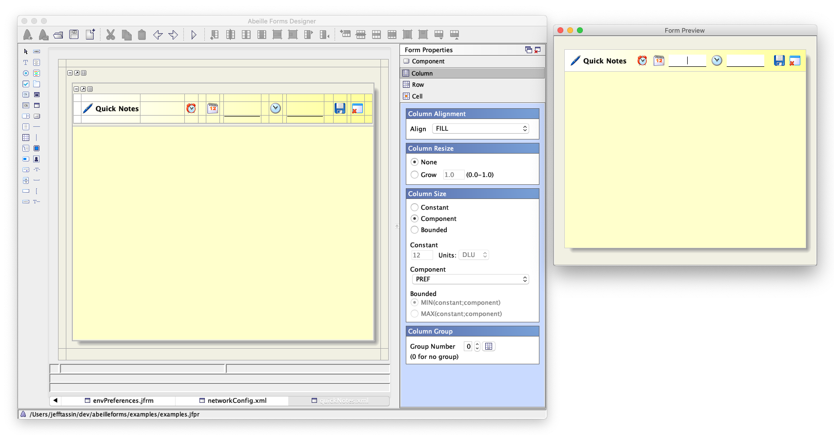 The FormLayout is a grid based layout manager. Forms can be created by defining a grid and adding Swing components to cells on the grid. Each cell, row, and column can be constrained to a specified size and resize behavior. In Abeille users can create forms by dragging Swing components from a pallette to a cell on the currently active form. Once GUI is completed, the design information is saved to a file. Abeille is not a code generator. Rather developers create form files using the designer and reference these files in their own applications to display the forms.