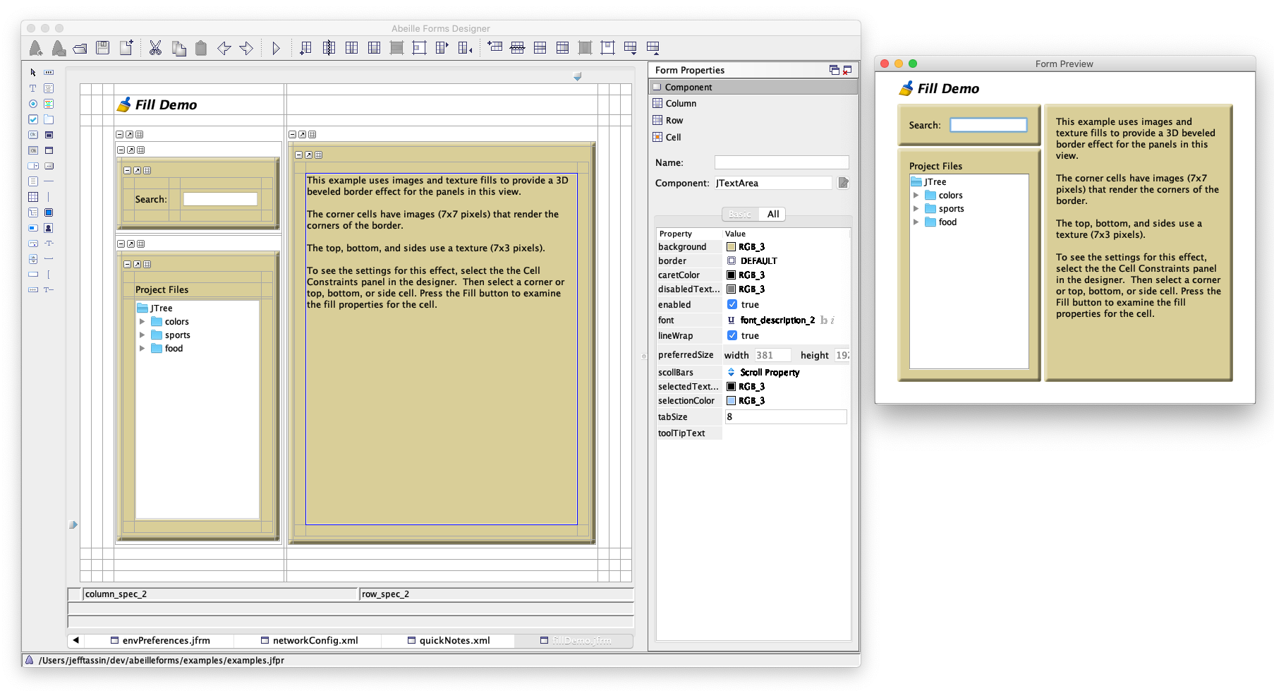 Forms Designer depends on the JGoodies FormLayout Manager (Forms Designer includes all the software you need). The FormLayout is a powerful, open source layout manager which you can use to programmatically create layouts in Java. Abeille works on top of the FormLayout and allows you to build forms visually using drag and drop. Abeille also includes support for images and painting effects such as gradients, textures, and dynamic colors (based on current look and feel).