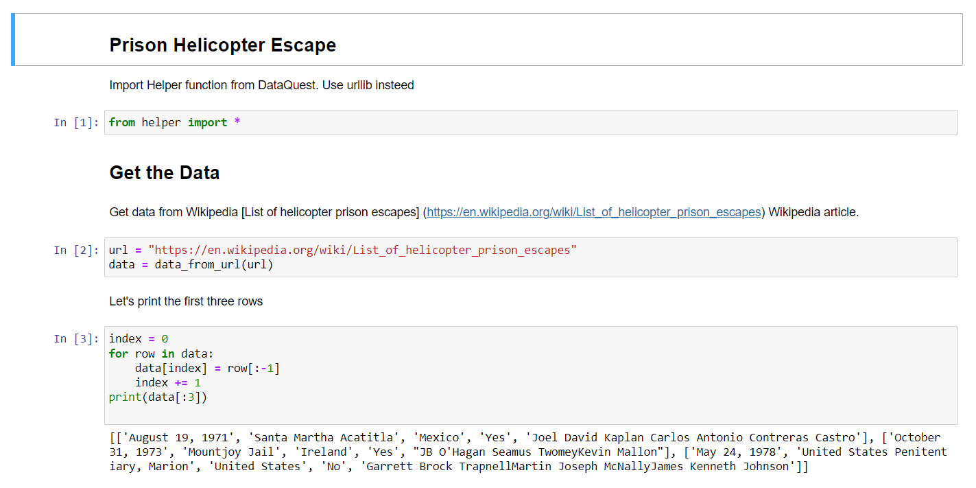 résumé : récupération d'un dableau regroupant toutes les évasion de prison a l'aide... d'un hélicoptère ! ce tableau de données ce trouvant sur Wikipédia, j'ai utilisé une fonction de récupération de donnée via l'url. A noter que DataQuest utilise un module custom pour ca. vous le trouverez dans helper.py. Sinon il faut utiliser urllib ou autre.