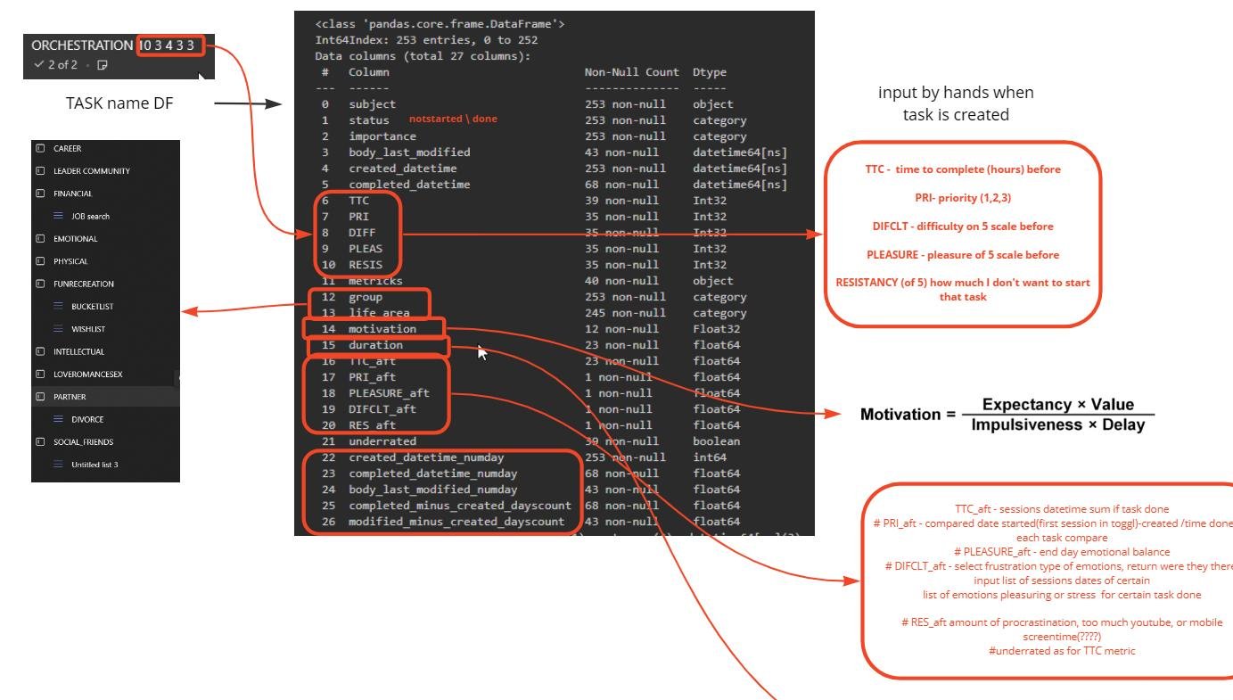 We collect the data from these sources: * Emotions and habits via Telegram bot, 4 times a day, reminders via Google calendar pushes * Actions on the computer from ActivityWatch * Android Activity from ActivityWatch, ActionDash. With root - we immediately take SQL files * Date from smartwatch(Miband4) from GadgetBridge * To-do lists and tasks from the Microsoft ToDo application (via the API - it's easier to immediately SQL-files) * Work sessions are tracked in Toggl (using the API)