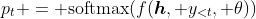 The training process uses the contextual vector $\boldsymbol{h}$ from the encoder to generate output tokens $y_t$ by the softmax function.
