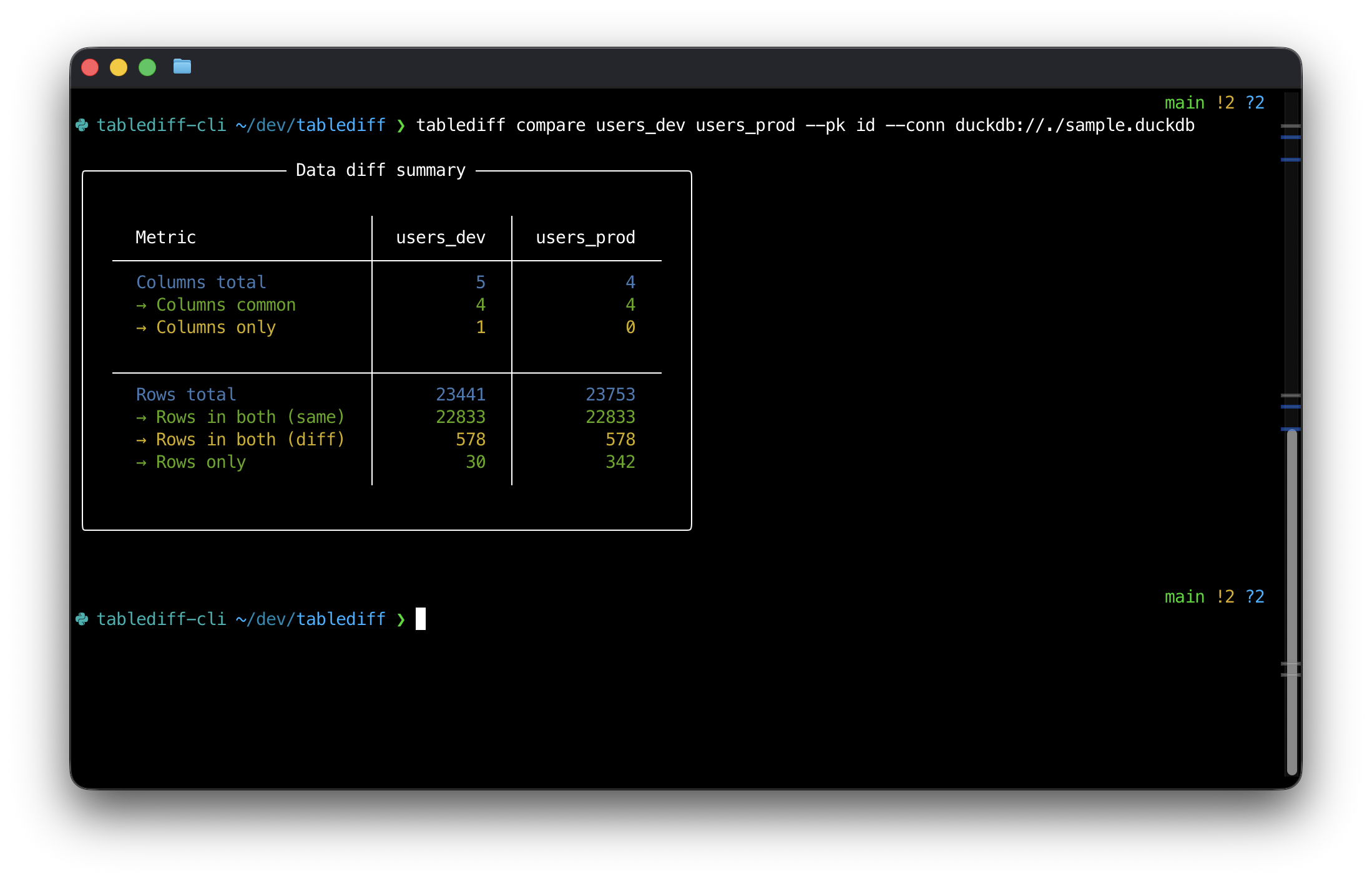 tablediff compare users_dev users_prod --pk id --conn duckdb://./sample.duckdb