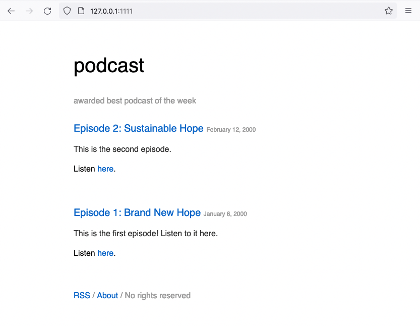 Clone, edit config.toml with your podcast details, delete example episodes, deploy.