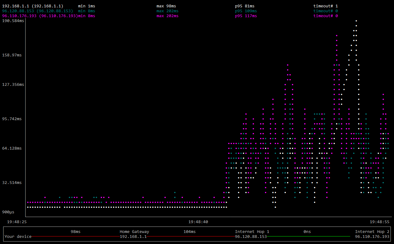 - Automatically computes the first 3 responding hops. This makes it easier for most people to troubleshoot their network connection and figure out if the problem is with WiFi or the Internet provider. Gping requires the person to figure out how to use traceroute and type in the host IPs.