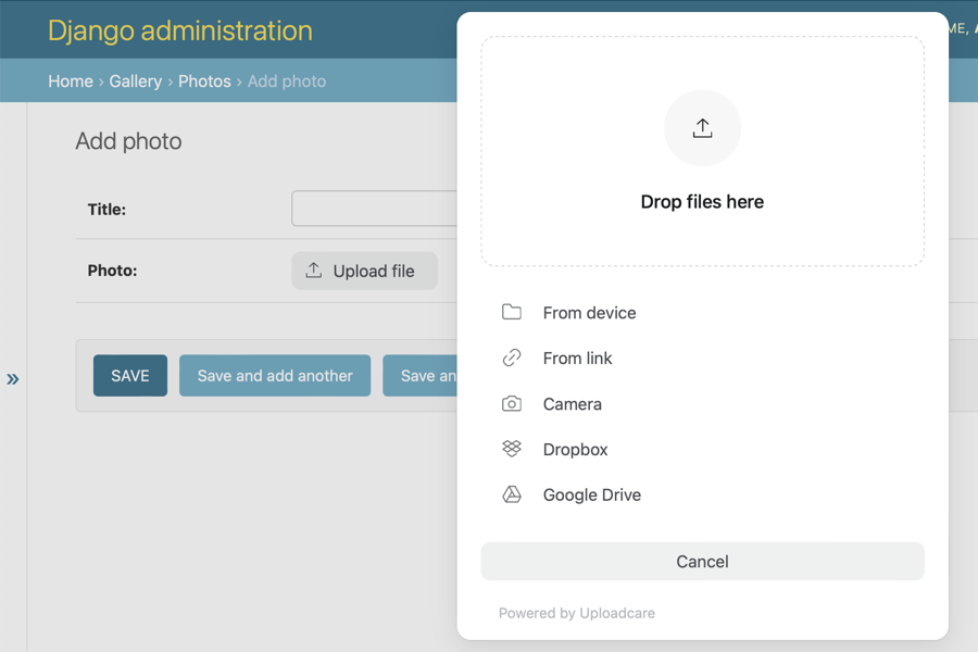 Obviously, you would want to use Uploadcare field outside an admin. It’s going to work just as well, but, however, you have to remember to add {{ form.media }} in the <head> tag of your page: