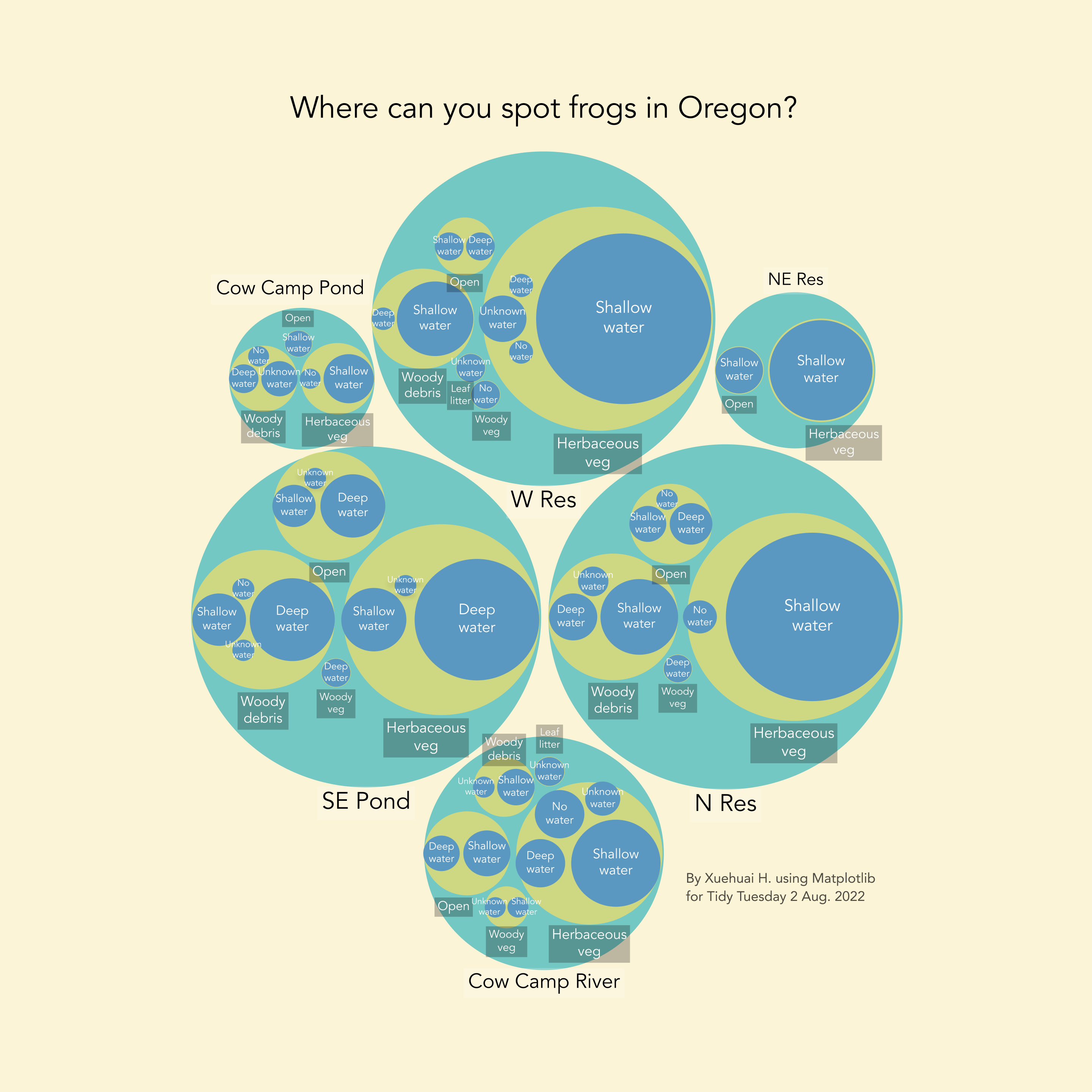 Frogs spotted in Oregon. I experimented with circle packing but it's so much pain that I would probably never do it again. Anyway here's the code and the pic.