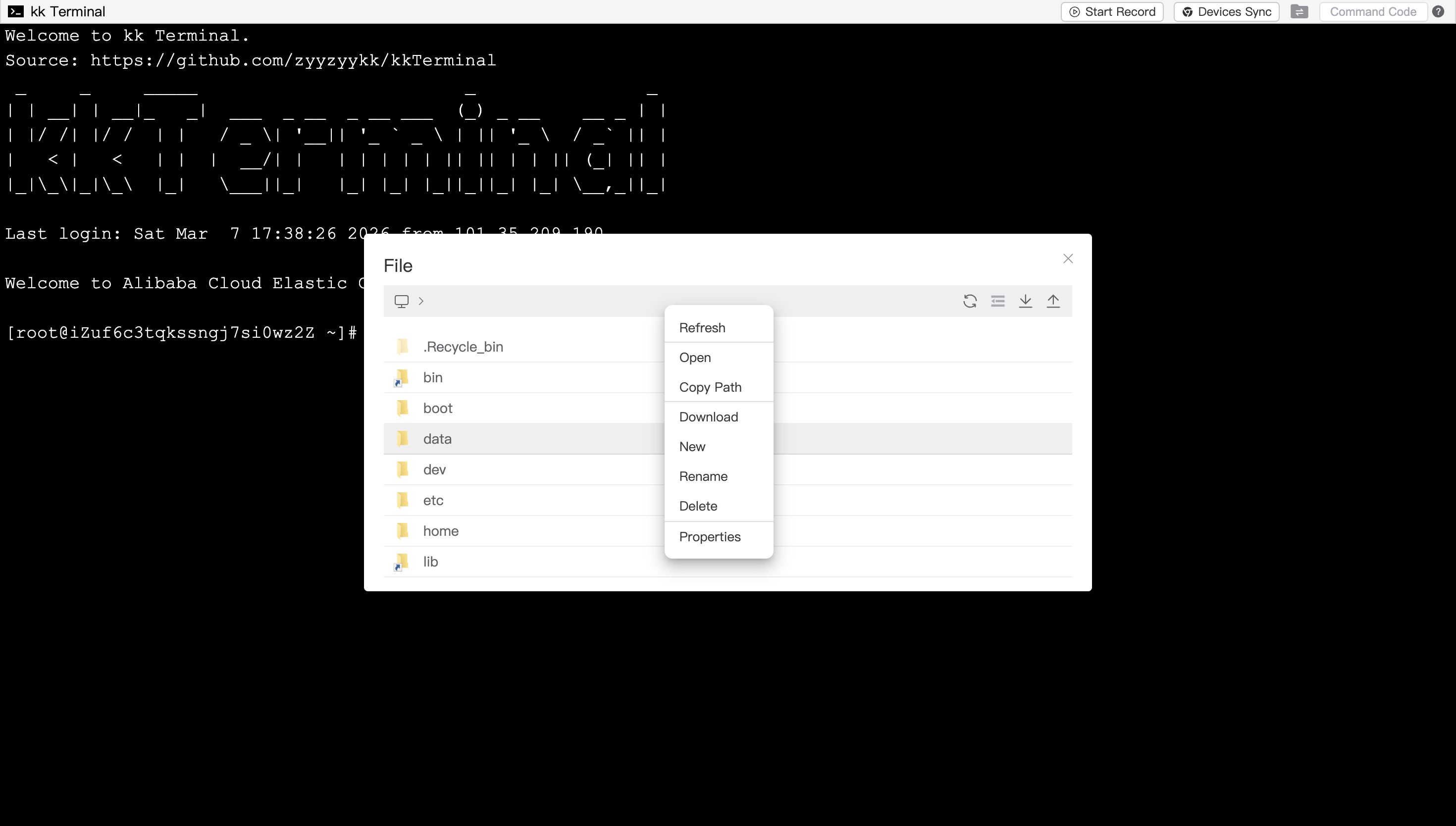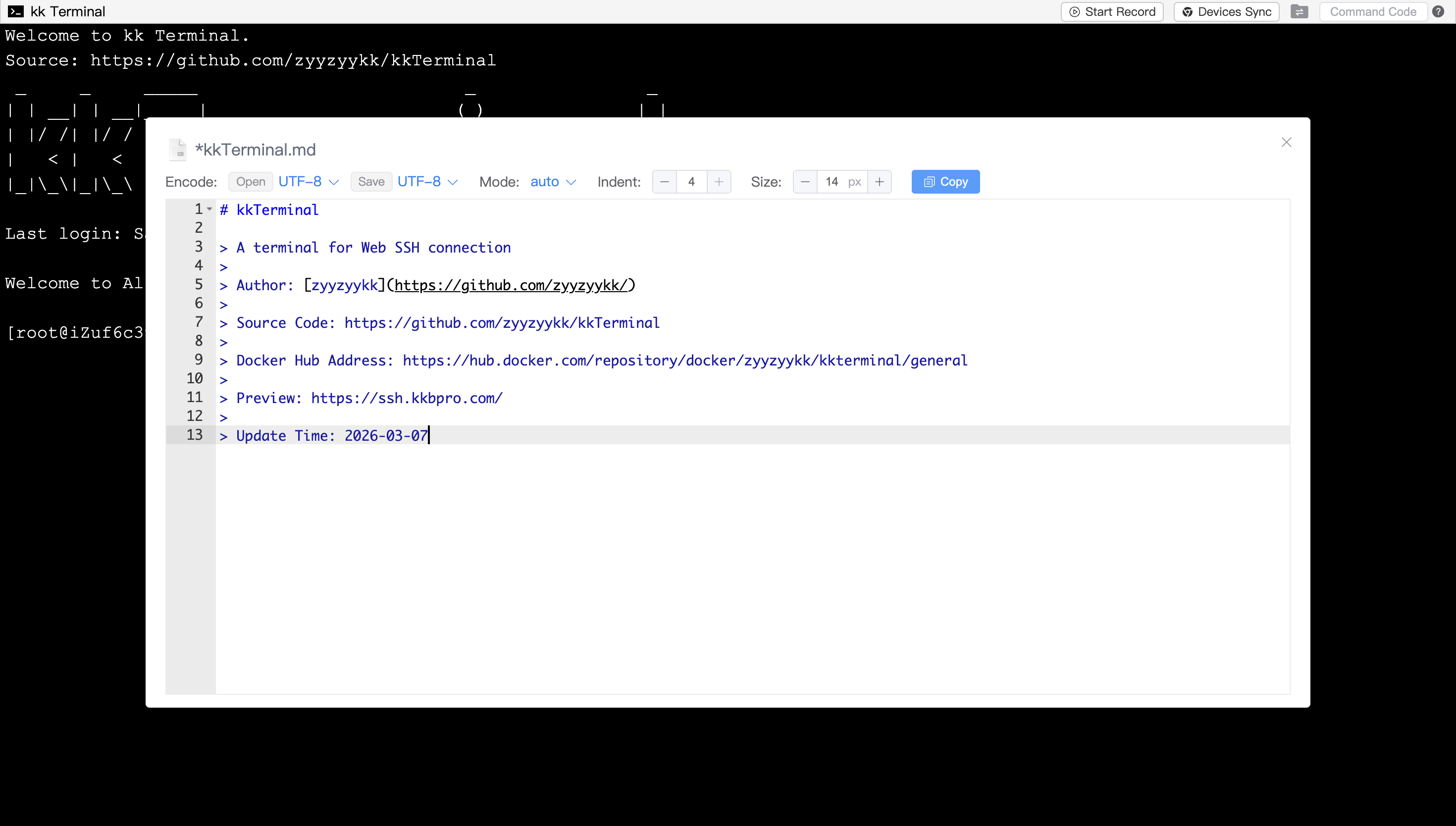 <p align="center"><a href="https://ssh.kkbpro.com/" target="_blank" rel="noopener noreferrer"><img width="100" src="https://kkbapps.oss-cn-shanghai.aliyuncs.com/logo/terminal.svg" alt="kkTerminal"></a></p> <p align="center"> <a href="https://hub.docker.com/repository/docker/zyyzyykk/kkterminal/general"><img src="https://img.shields.io/docker/pulls/zyyzyykk/kkterminal?logo=docker" alt="Docker Image"></a> <a href="https://www.oracle.com/cn/java/technologies/downloads/#java8-windows"><img src="https://img.shields.io/badge/jdk-21-orange?logo=openjdk&logoColor=%23e3731c" alt="JDK Version"></a> <a href="https://spring.io/projects/spring-boot"><img src="https://img.shields.io/badge/springboot-3.5.10-green?color=6db33f&logo=springboot" alt="SpringBoot Version"></a> <a href="https://cn.vuejs.org/"><img src="https://img.shields.io/badge/vue-3.x-green?color=42b883&logo=vue.js" alt="Vue Version"></a> <a href="https://www.apache.org/licenses/"><img src="https://img.shields.io/badge/licence-Apache-red?logo=apache&logoColor=%23D22128" alt="Apache Licence"></a> <a href="https://github.com/zyyzyykk/kkTerminal"><img src="https://img.shields.io/github/stars/zyyzyykk/kkterminal" alt="GitHub"></a> </p> <p align="center">English | <a href="./doc/zh_CN/README.md" >简体中文</a></p>A terminal for Web SSH connection